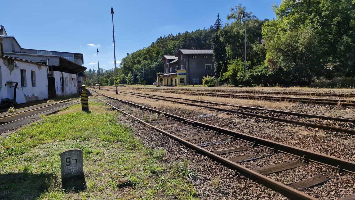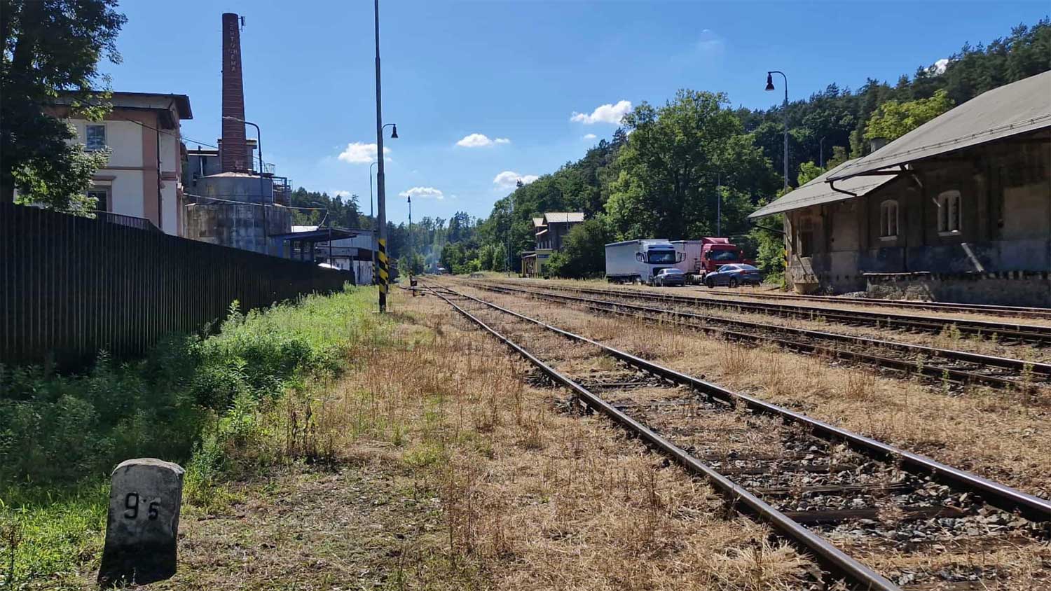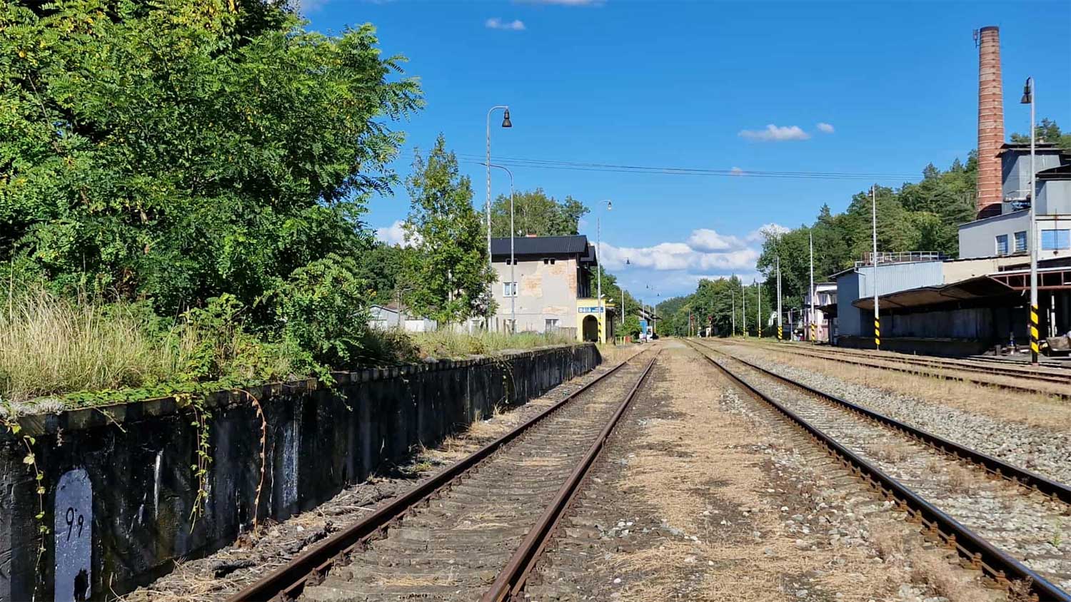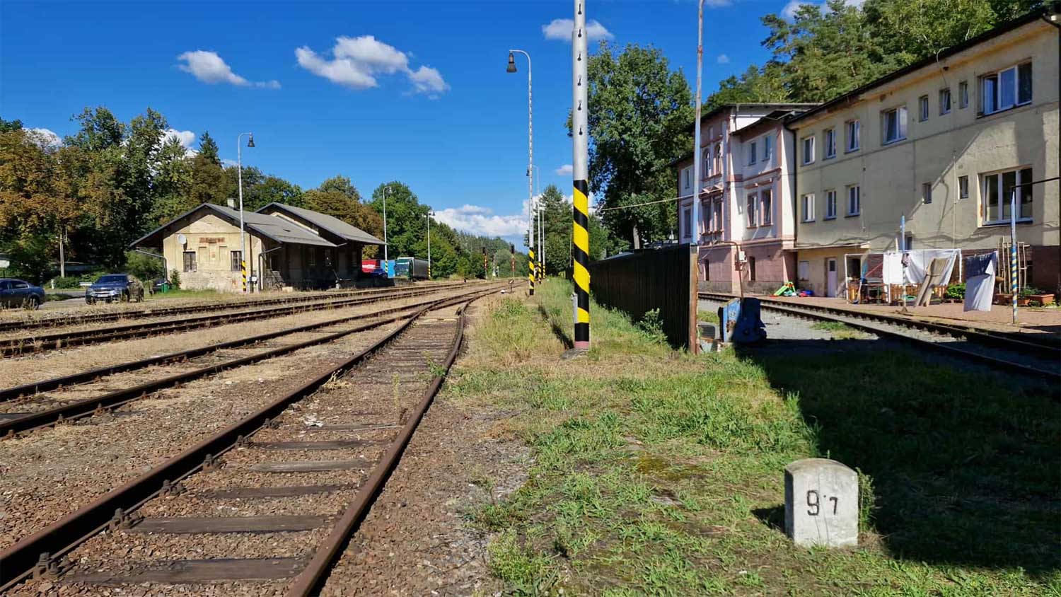 Im Vordergrund die ankommende Strecke von Bakov nad Jizerou (Bakow)