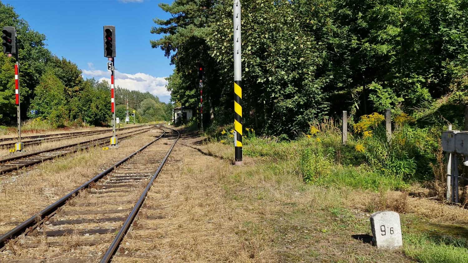 | km 21,832 der Strecke Böhmisch Kamnitz (Česká Kamenice) 0,0 - Steinschönau (Kamenický Šenov) 4,457 = km 0,0 - Böhmisch Leipa Stadtpark (Česká Lípa střelnice) 21,834 | ||