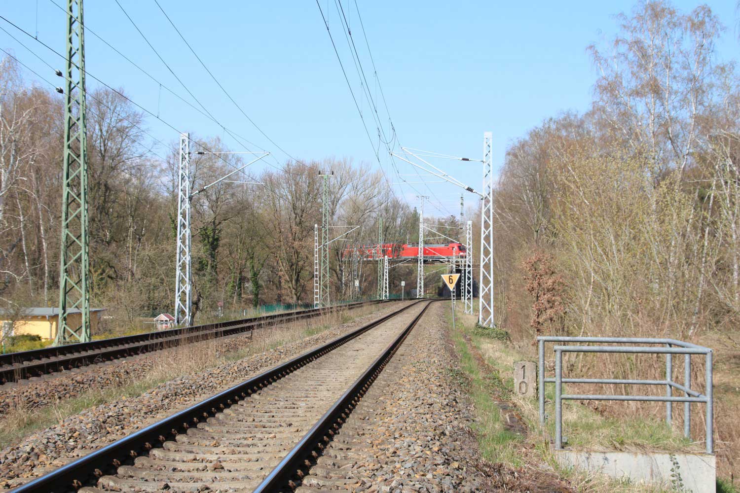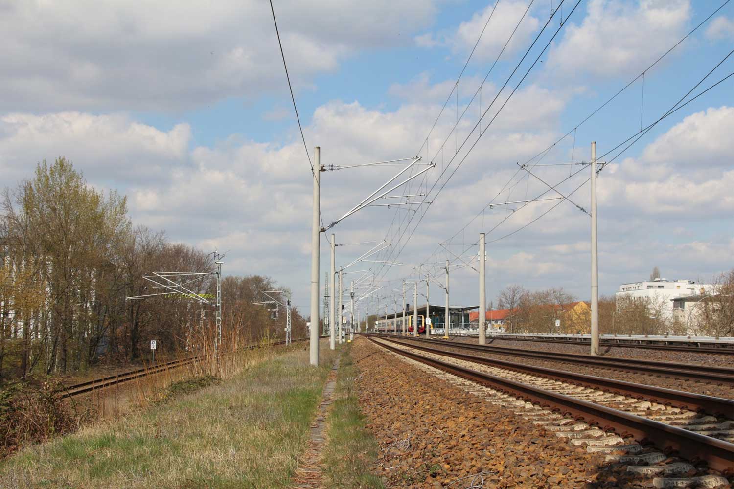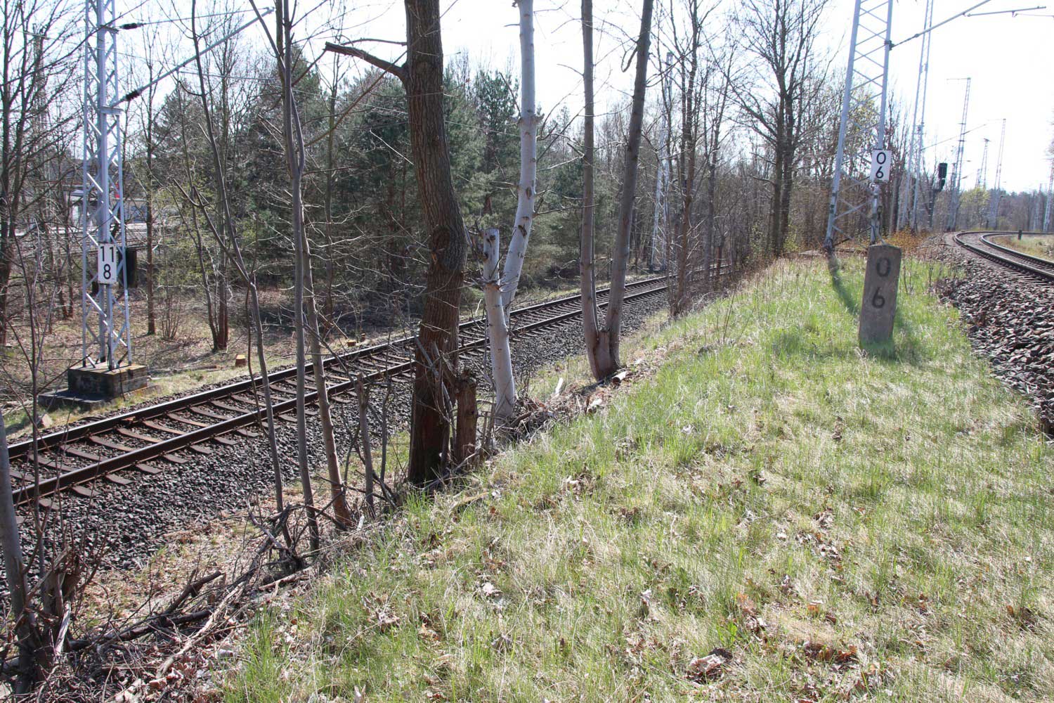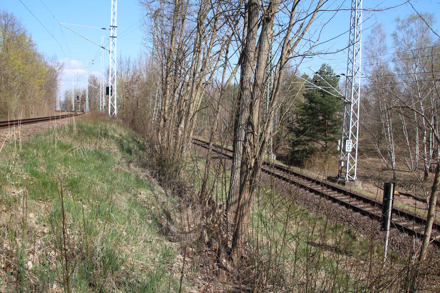 km 11,4 Rechts die beiden Gleise der Görlitzer Bahn (6142) mit km
