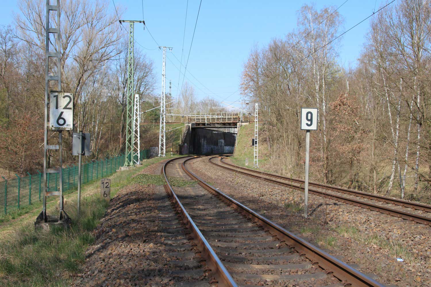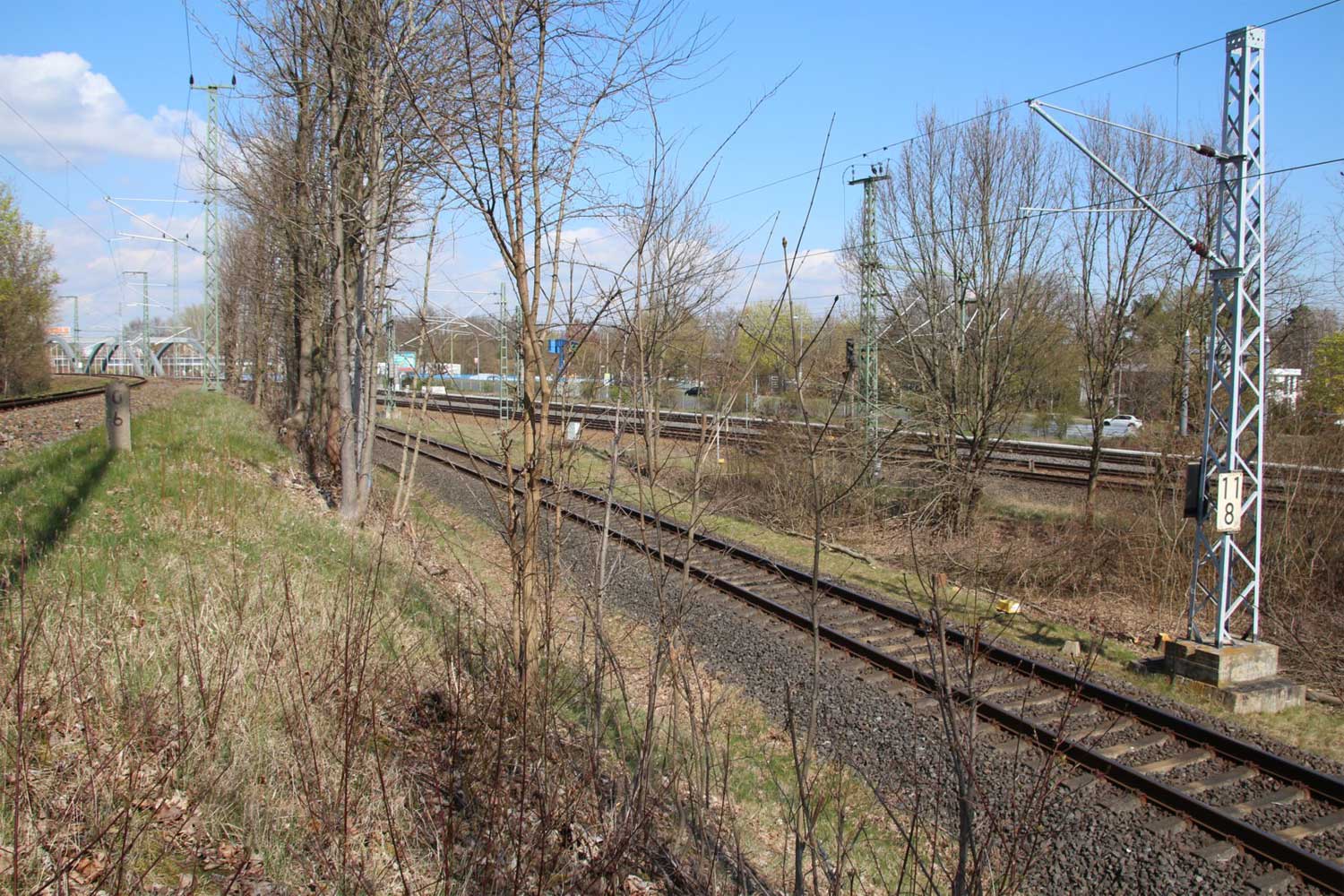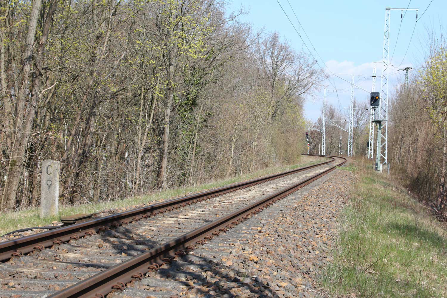 km 11,4 Rechts die beiden Gleise der Görlitzer Bahn (6142) mit km