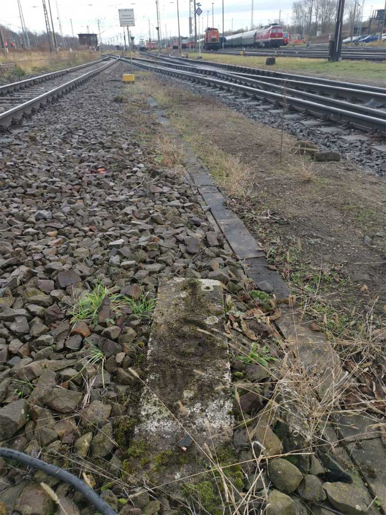 km 1,7 (liegender Stein) in Wustermark Rbf km 2,2 gehört zur Strecke Priort, W 71, km -0,21 - Wustermark Rbf, W 228, km 2,414 (6104) [früher: Abzw