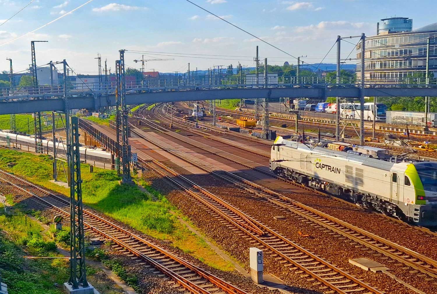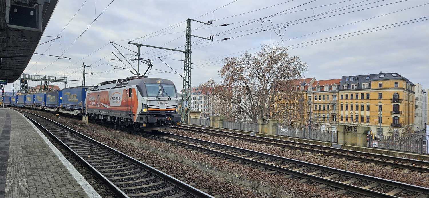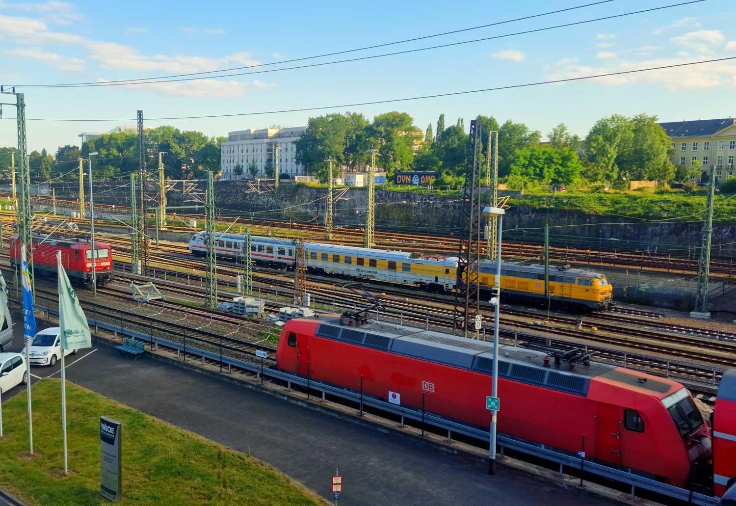 Im Hintergrund der S-Bahnhof Dresden Freiberger Straße an der Strecke