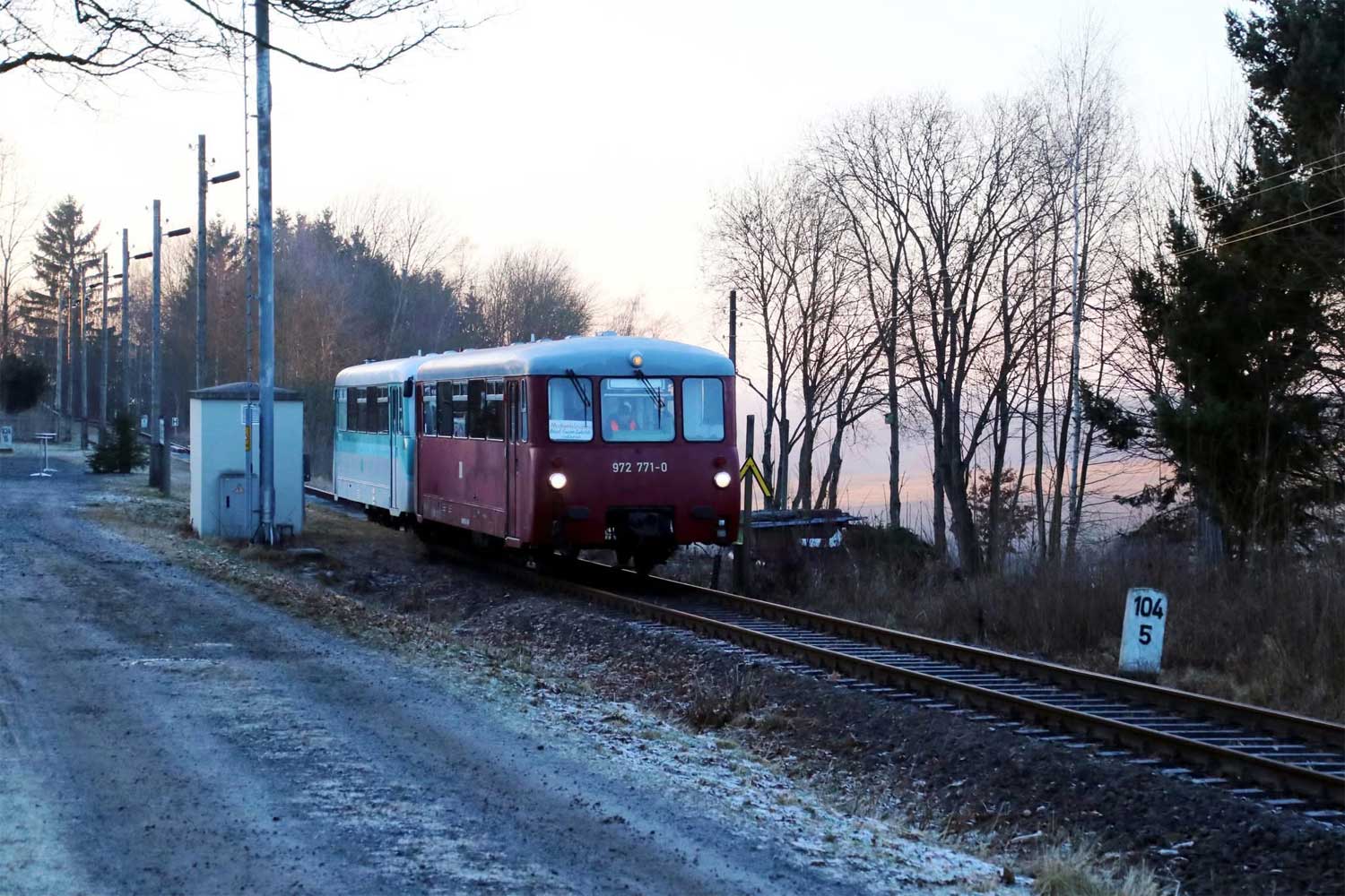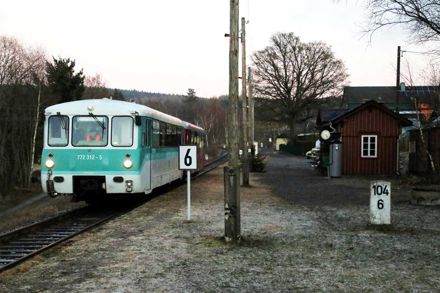 Zwotental 101,568 km -0,42 der Strecke Zwotental 0,0 - Klingenthal 8,234 - Grenze Deutschland/Tschechoslowakei 8,770 = {km 27,452 - Sokolov [früher: Falkenau (Eger)] 0,0 } (ZK)