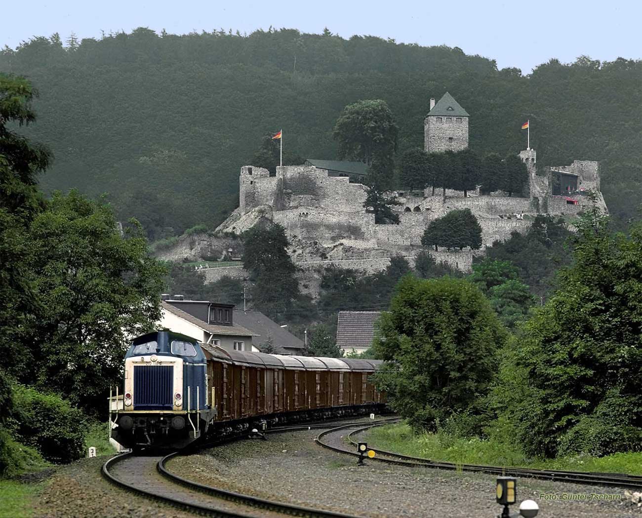 Im Hintergrund die imposante Ruine der Burg Sayn, eine im 12. Jahrhundert erbaute Stammburg der Grafen von Sayn bzw. Sayn-Wittgenstein