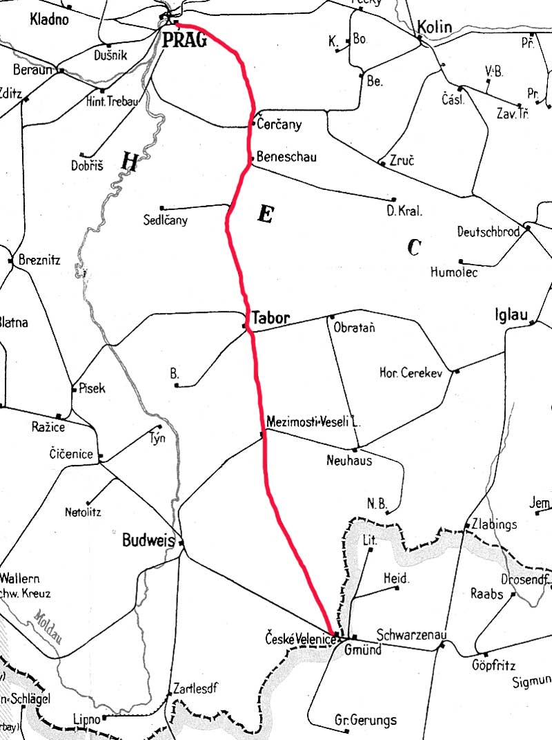 Gmünd Hbf (Waldviertel) 0,365 - Grenze Niederdonau/Protektorat Böhmen und Mähren 13,021 - Mesimost (Naser) / Mezimostí nad Nežárkou 55,236 - Tabor / Tábor 81,761 - Olbramowitz / Olbramovice 119,280 - Beneschau / Benešov u Prahy 134,527 - Tschertschan / Čerčany 143,807 - Prag Hiberner Bahnhof-Hrabovka / Praha Hybernské nádraží-Hrabovka 187,107