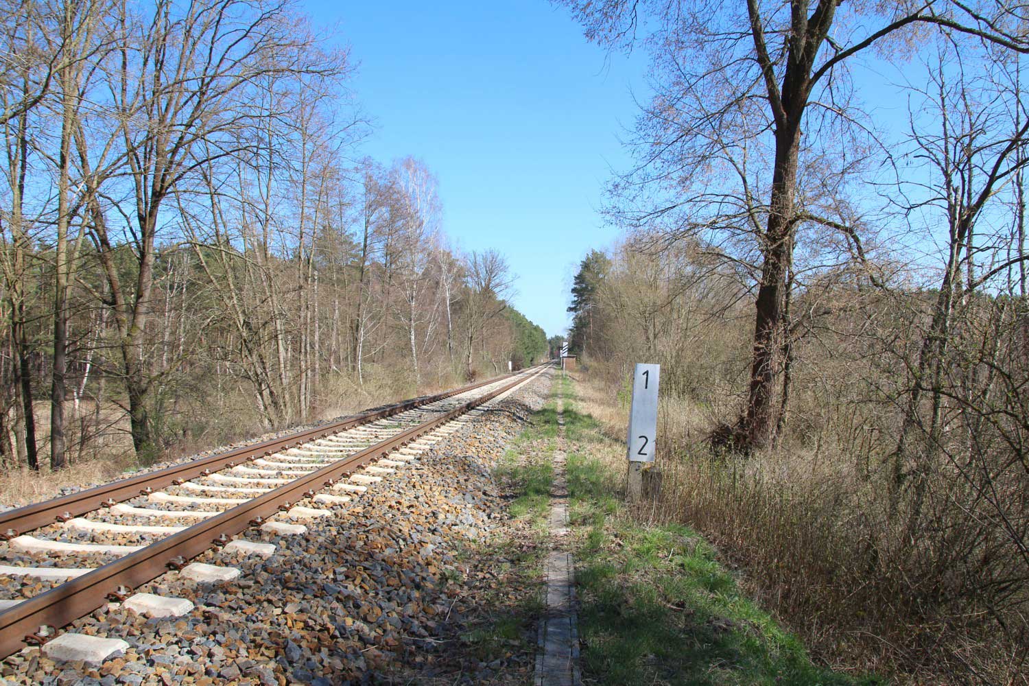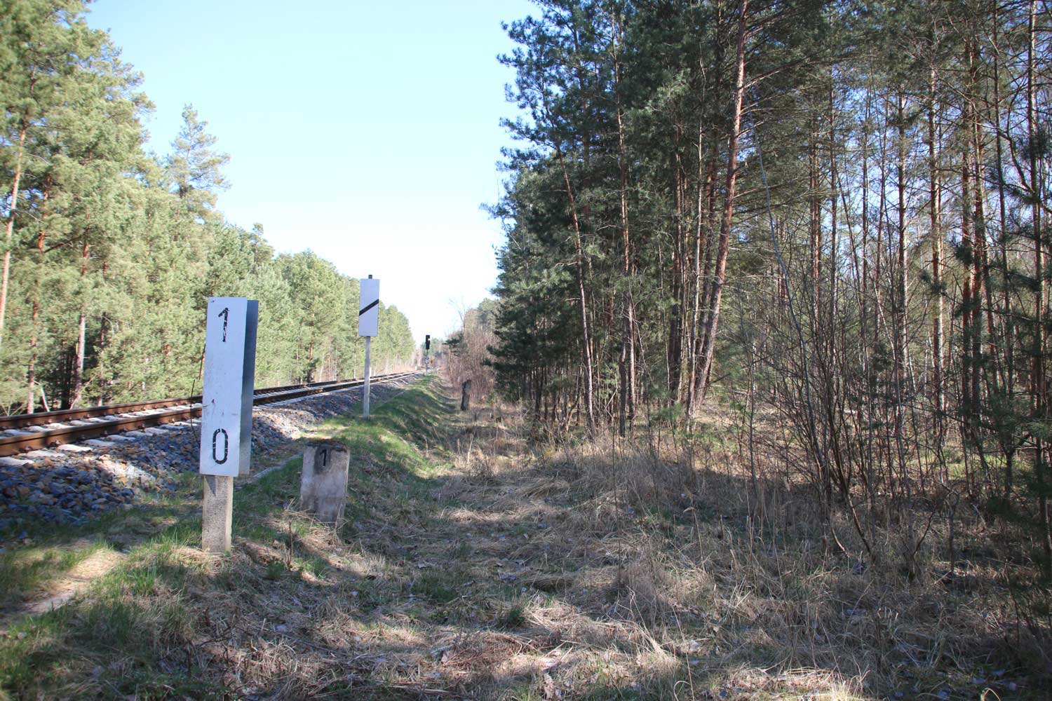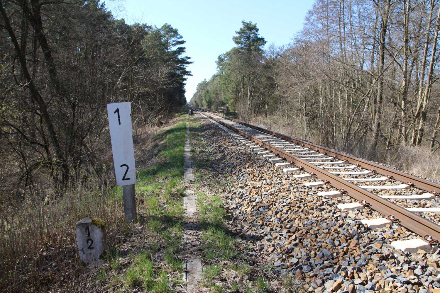 km 1,0 (Tafel und Stein) zwischen Grunow (Niederlausitz) und Schneeberg (Mark) am ehemaligen Abzw Grunow (Niederlausitz) - Blick Richtung Grunow (Niederlausitz)