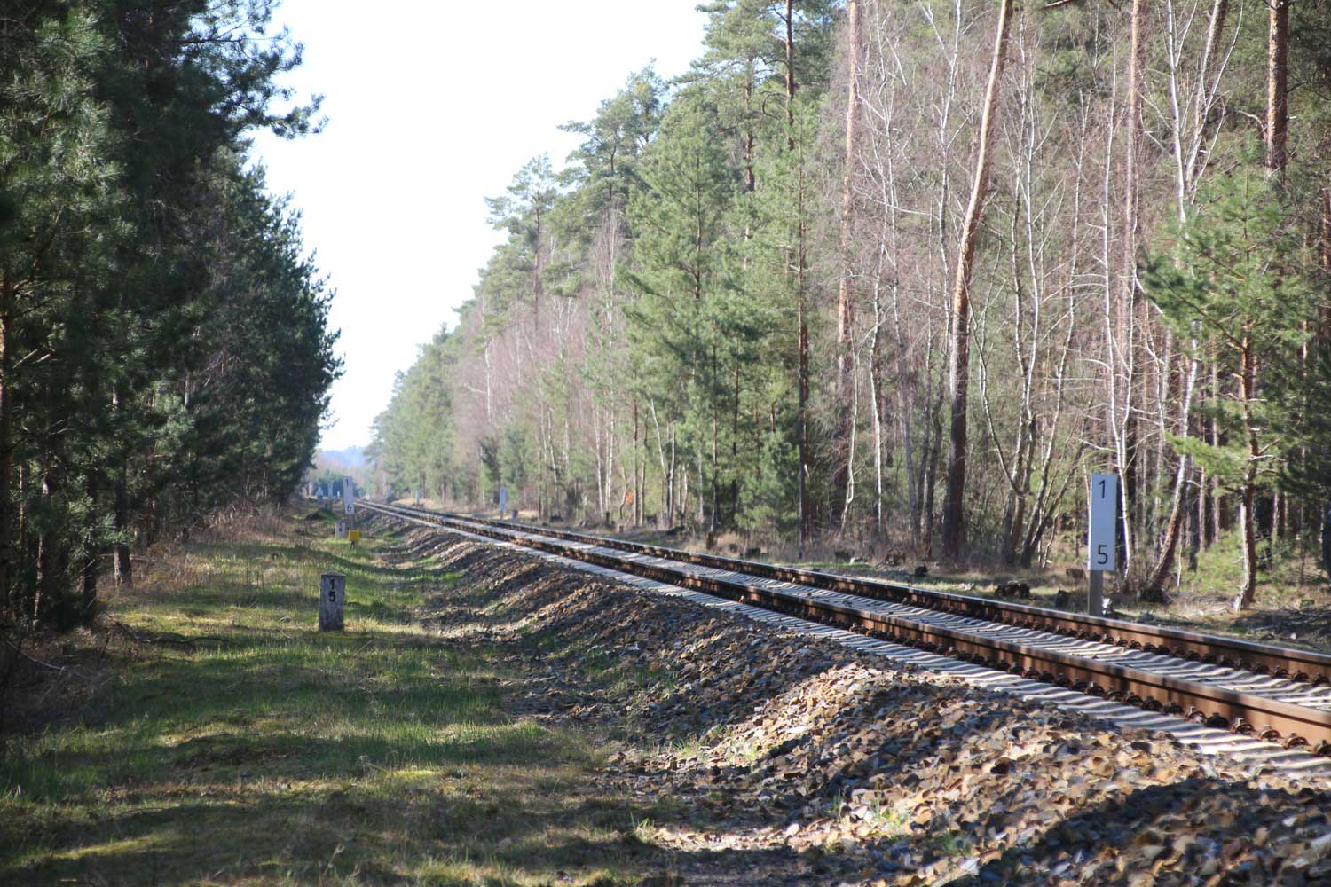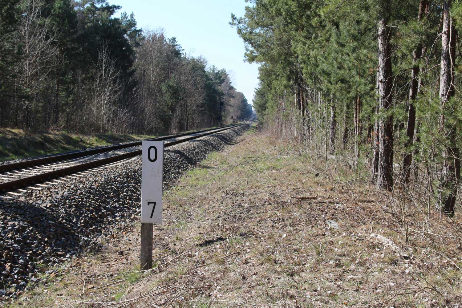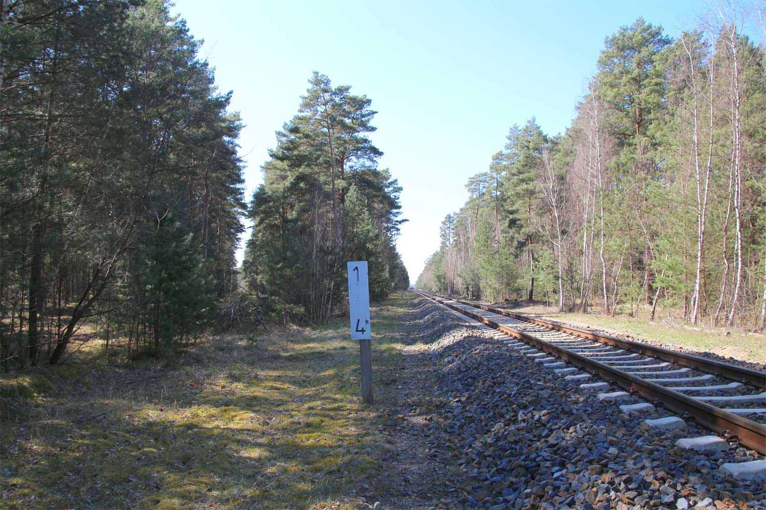 km 1,0 (Tafel und Stein) zwischen Grunow (Niederlausitz) und Schneeberg (Mark) am ehemaligen Abzw Grunow (Niederlausitz) - Blick Richtung Grunow (Niederlausitz)
