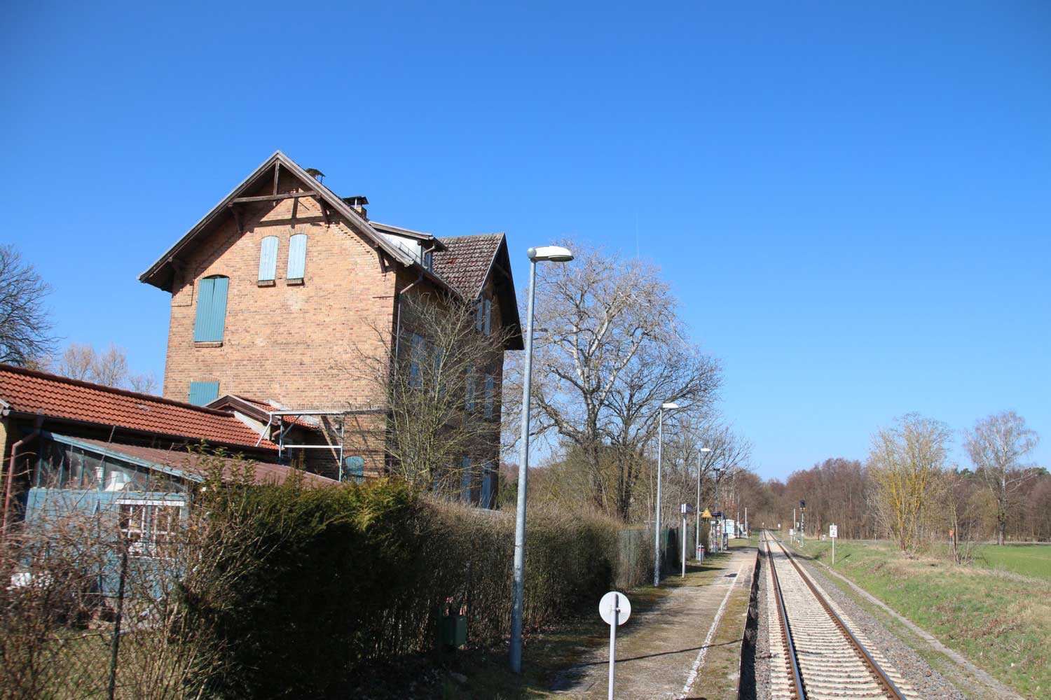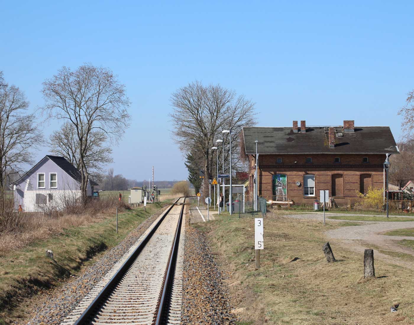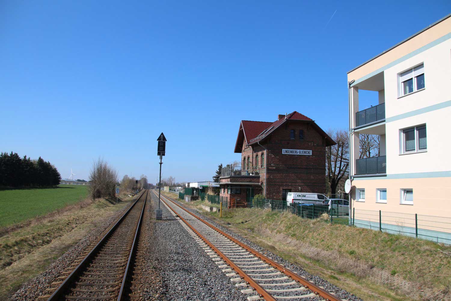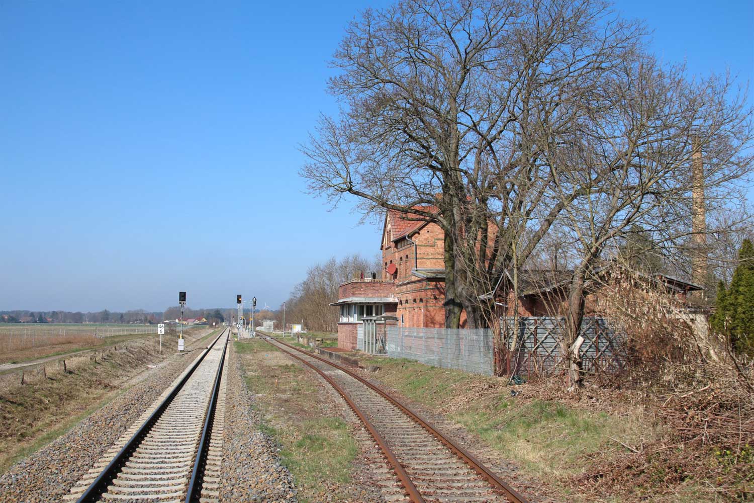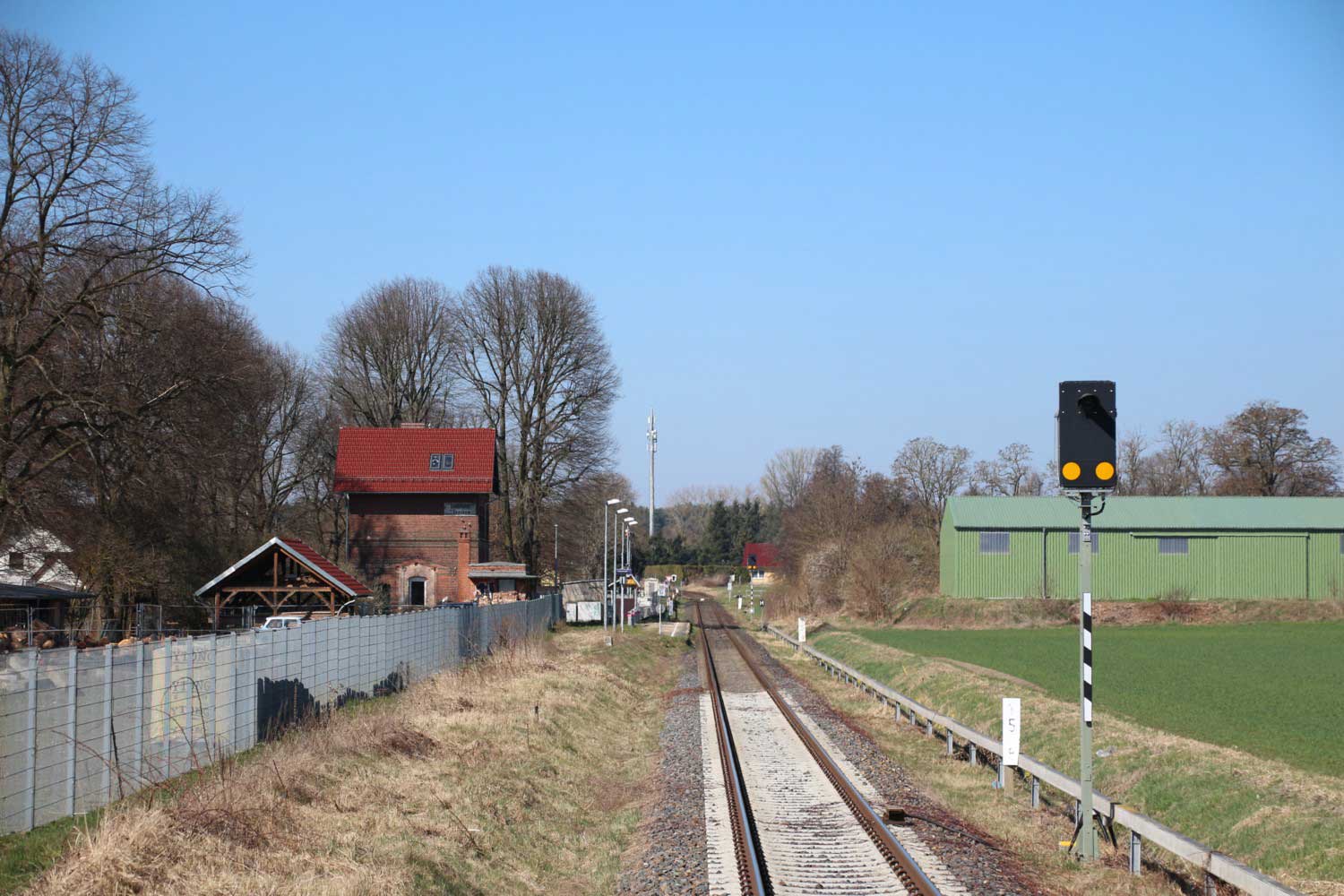 Links am Gebäude km 129,3 der Strecke Großenhain Cottbuser Bf 0,0 - Senftenberg 45,29 - Cottbus 79,67 - Frankfurt (Oder) Pbf 152,85 (Personenzuggleise)/152,79 (Güterzuggleise)