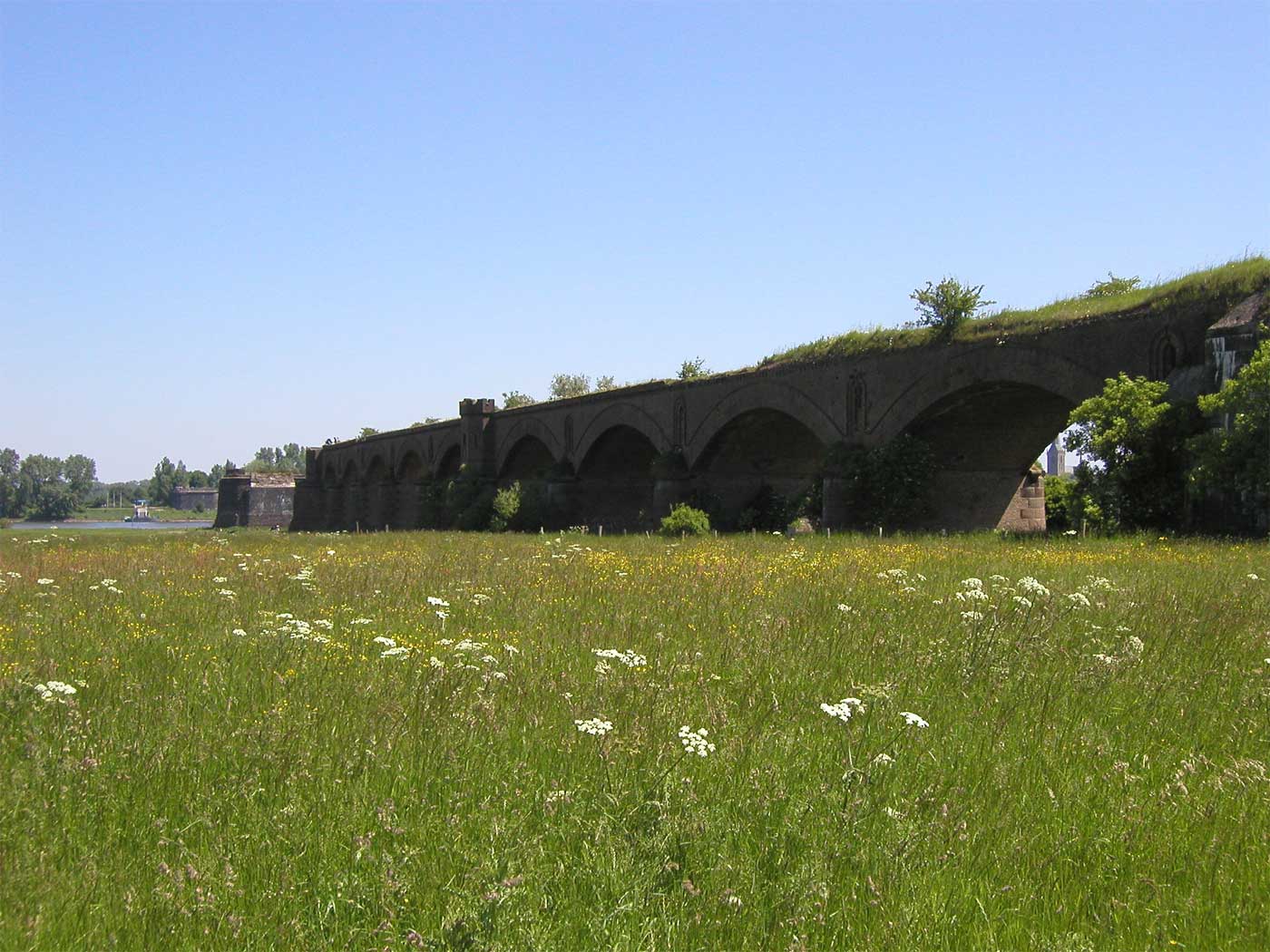 Rechtsrheinischer Brückenpfeiler (ganz links) etwa km 45,0, rechts etwa km 45,8