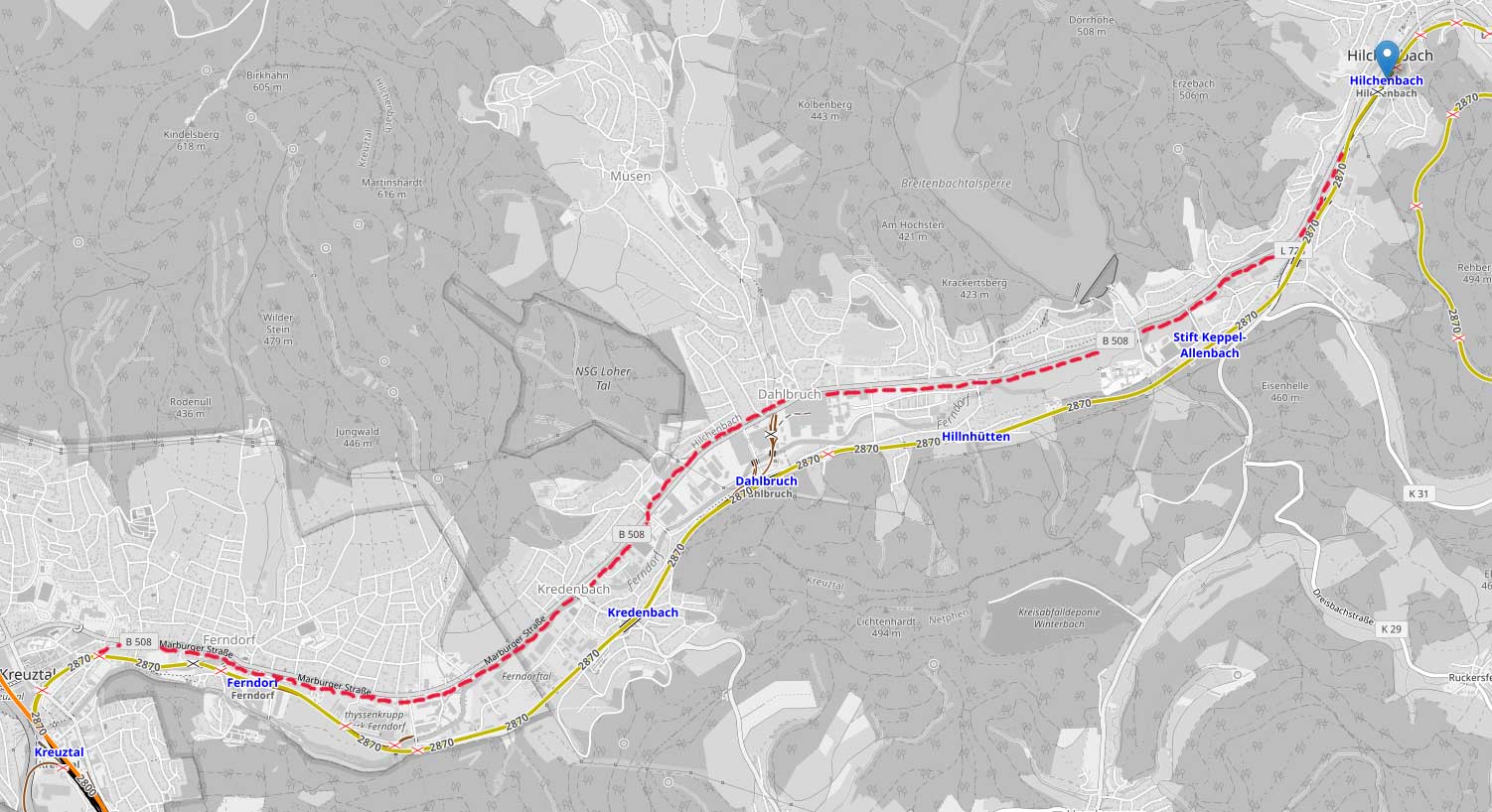 Nach der topografischen Karte des Deutschen Reichs von 1897 verlief die Strecke Kreuztal - Cölbe zwischen Ferndorf und Hilchenbach entlang der Straße (heutige B 508).