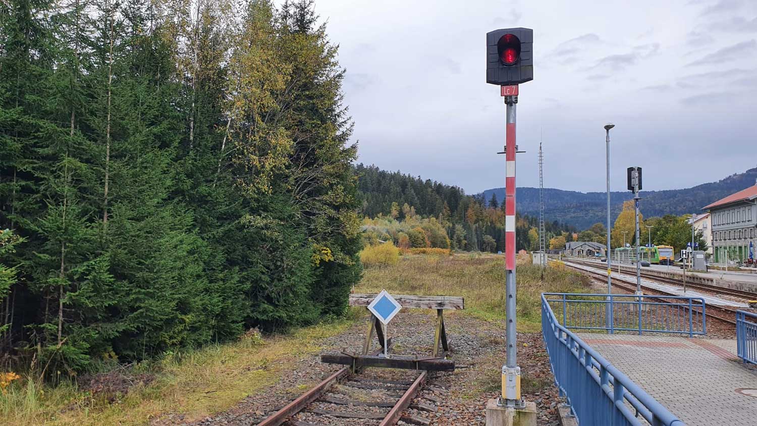 km 96,4 (Tafel im Hintergrund) in Gotteszell - ehemaliges Stellwerk