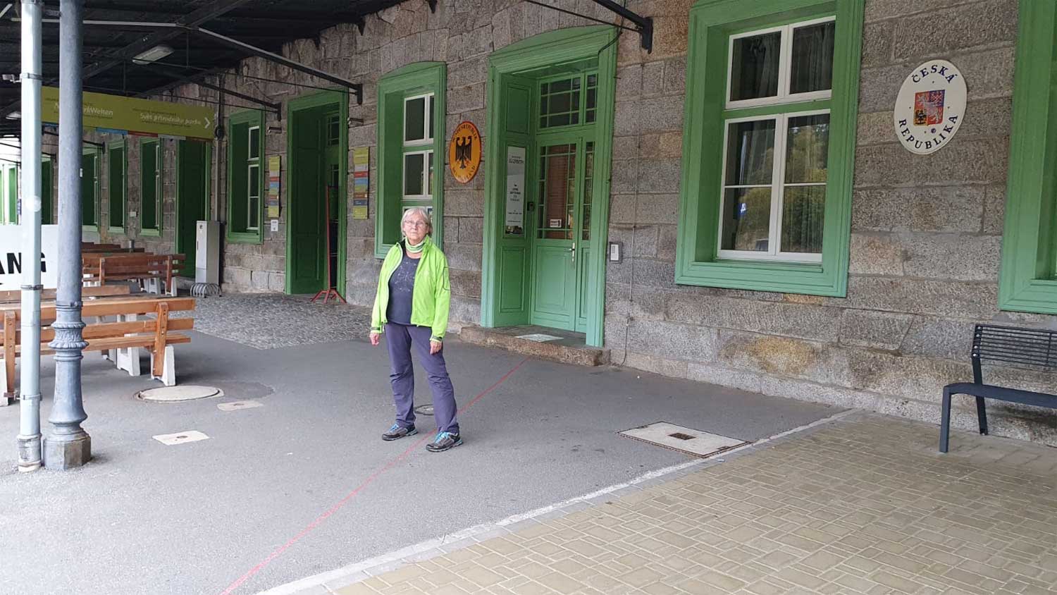 Bahnhofsgebäude Bayerisch Eisenstein mit Grenzlinie auf der Straße