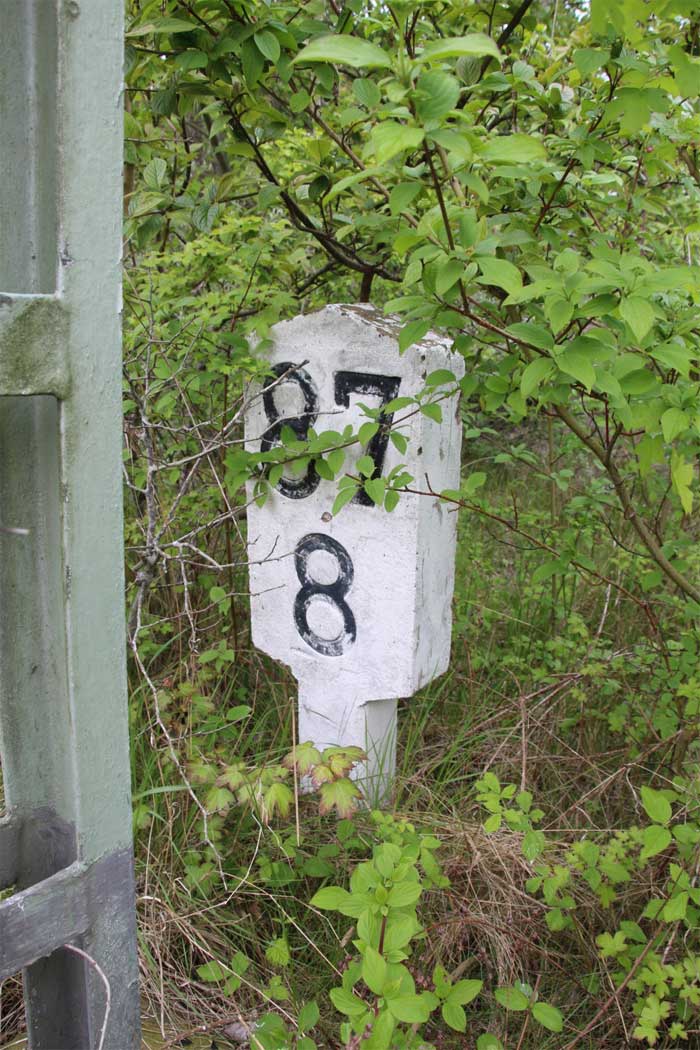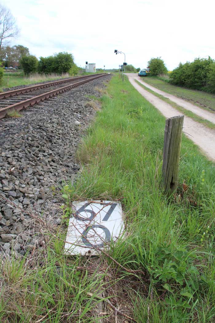 | km -1,63 der Strecke Lübeck Hbf -1,63 - Büchen 47,61 (Die Angabe km -1,63 sollte die Überlänge bei km 4,0/4,2 korrigieren, wurde aber vor Ort wahrscheinlich nie ausgeführt.) | ||