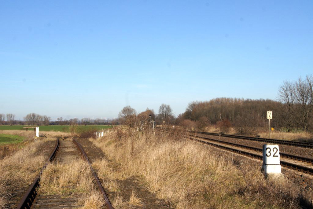 km 36,0 (Tafel) und km 36,1 (Stein) zwischen Hadmersleben und Oschersleben im Bereich des ehemaligen Gbf Oschersleben