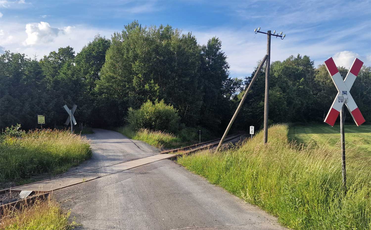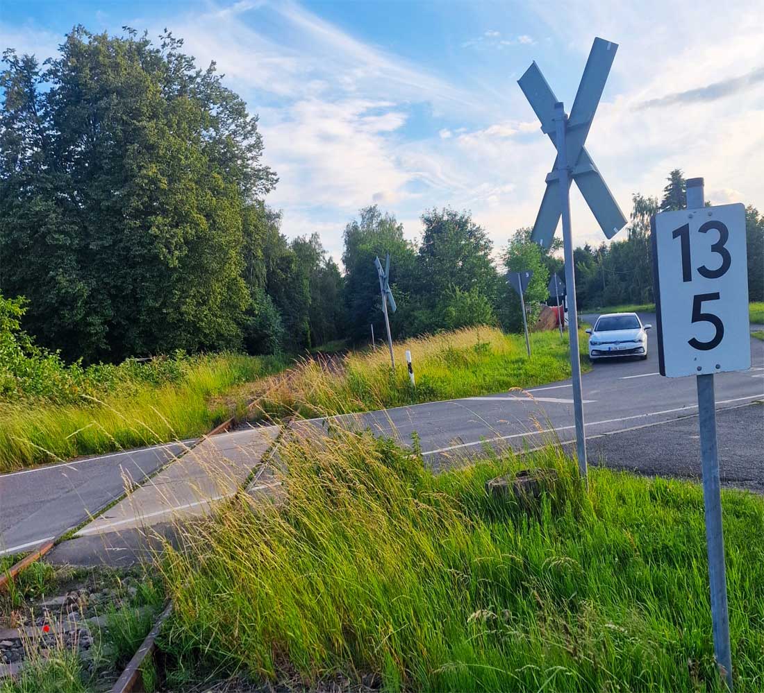 Feldweg-BÜ, Kilometerstein, F-Hütte, Grenzzeichen und Telegrafenmast - alles passt sehr gut zusammen.