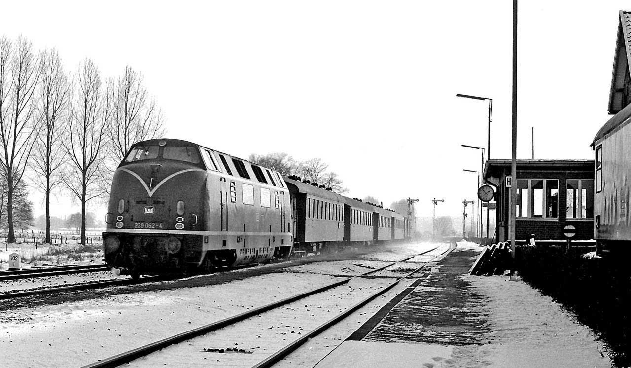 Die 220 070 in Eversburg auf dem Weg nach Wilhelmshaven. Die Schrankenanlage ist inzwischen automatisiert.