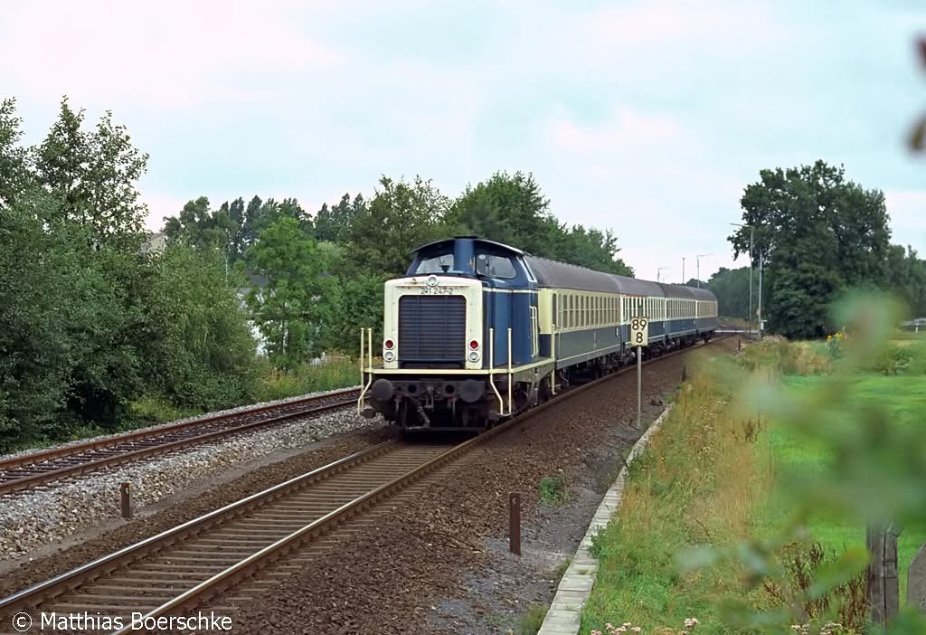 Beim km 101.3 hat die 220 027 Einfahrt in den Bahnhof Halen erhalten.