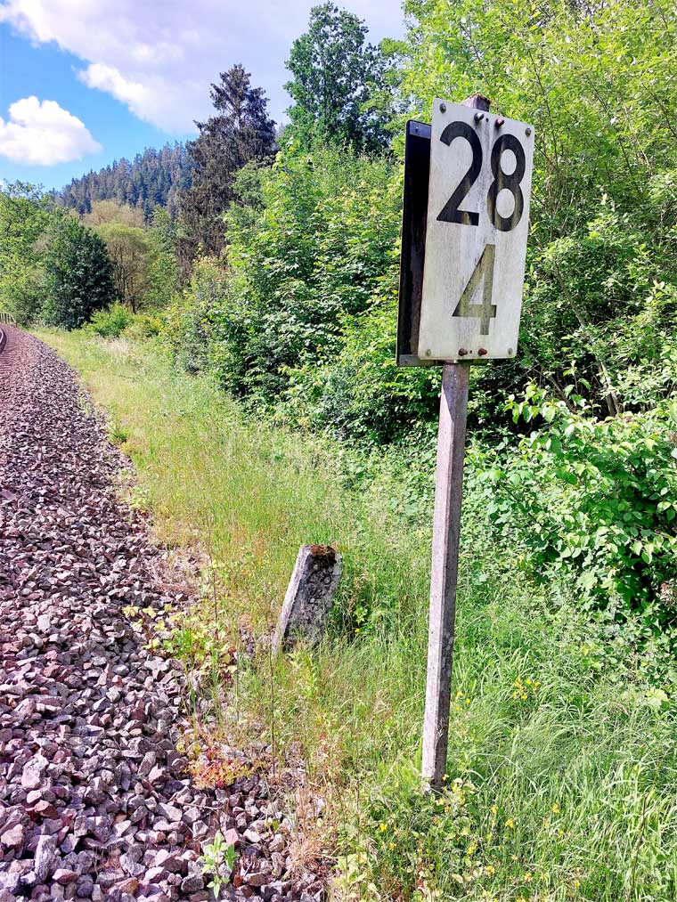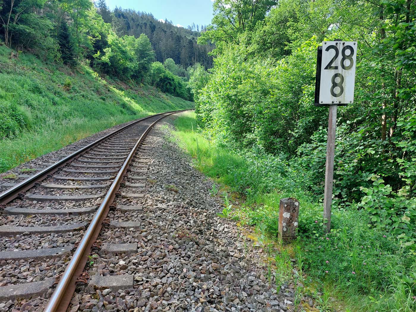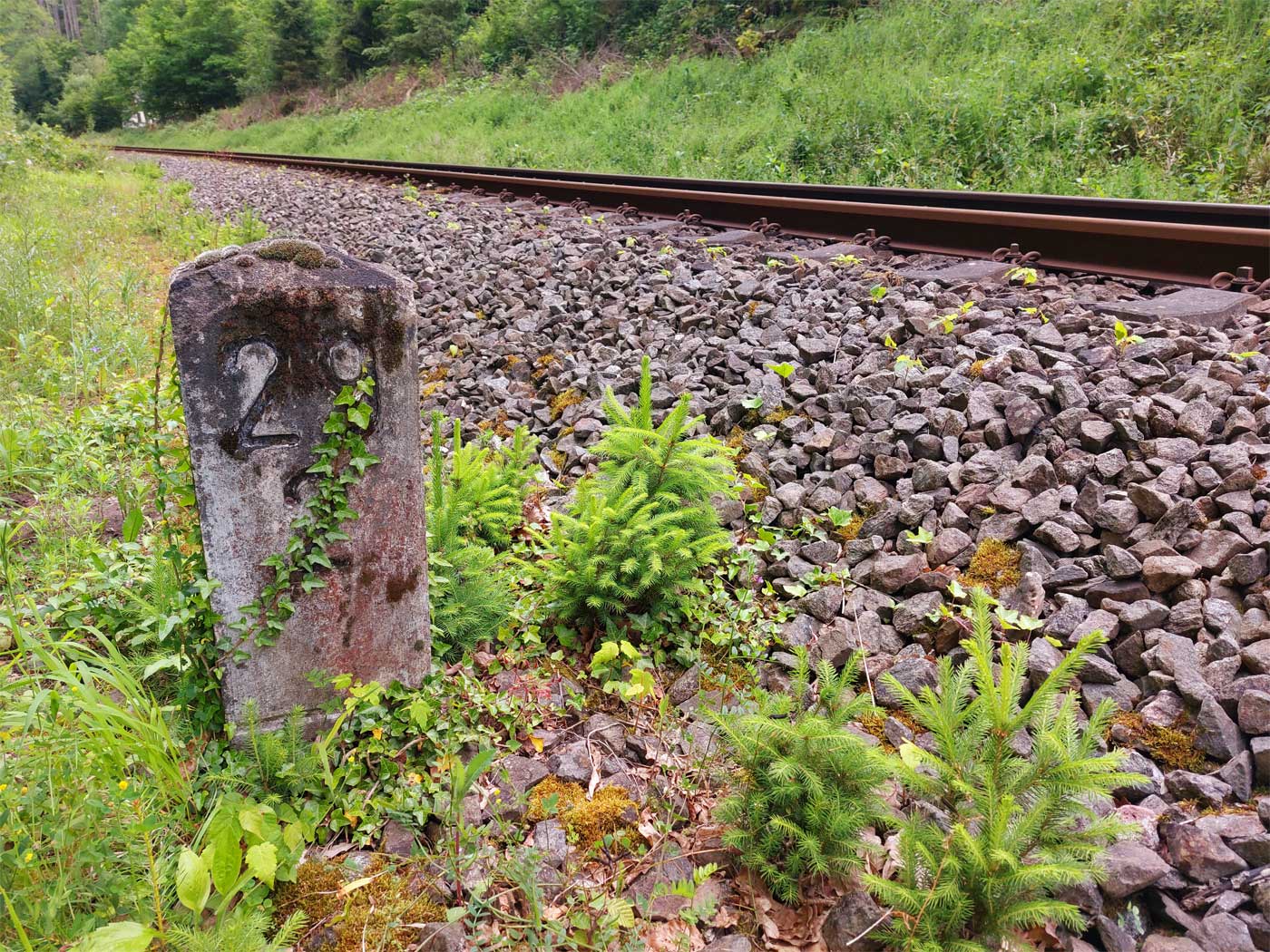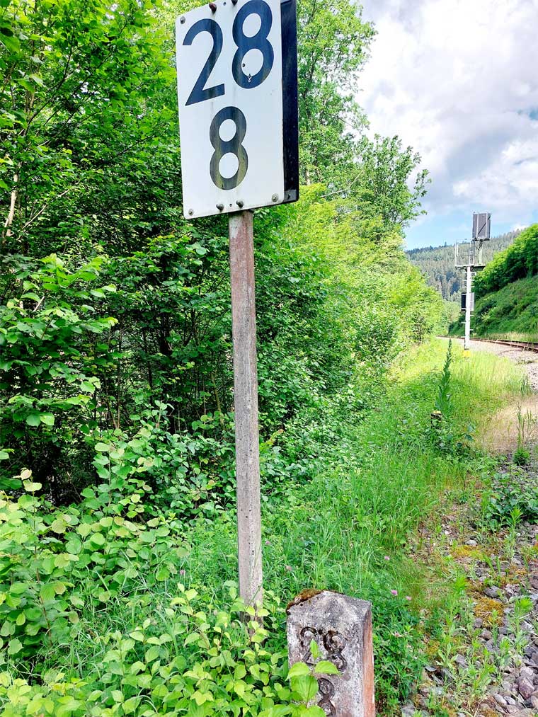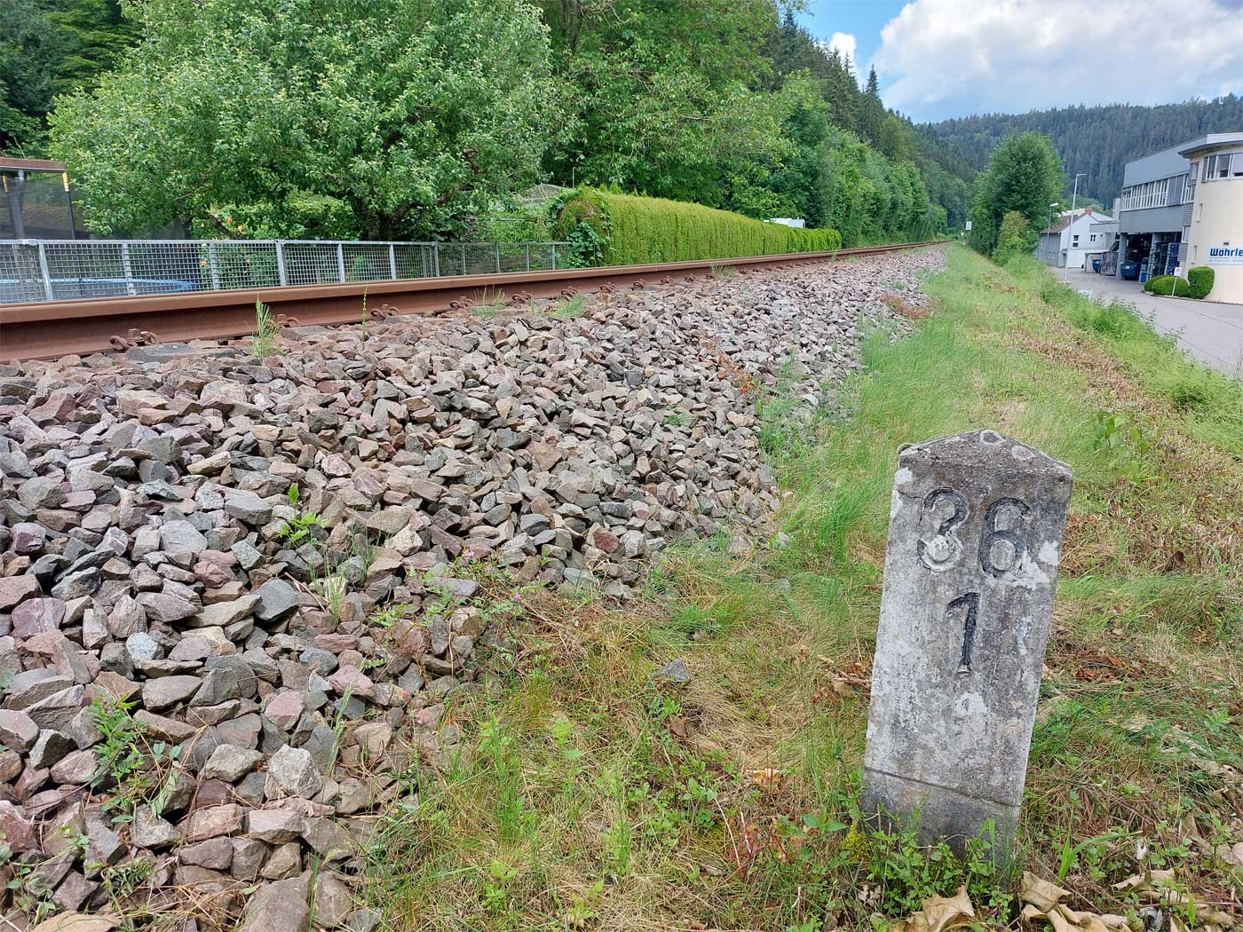 Im Hintergrund die Strecke Eutingen im Gäu - Freudenstadt Hbf - Schiltach mit der Kilometertafel 2,2