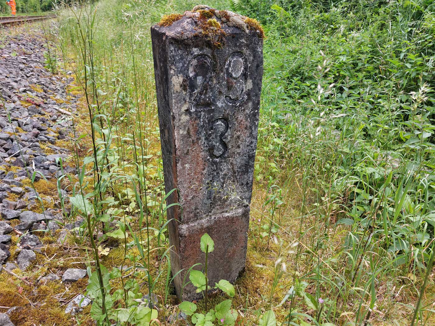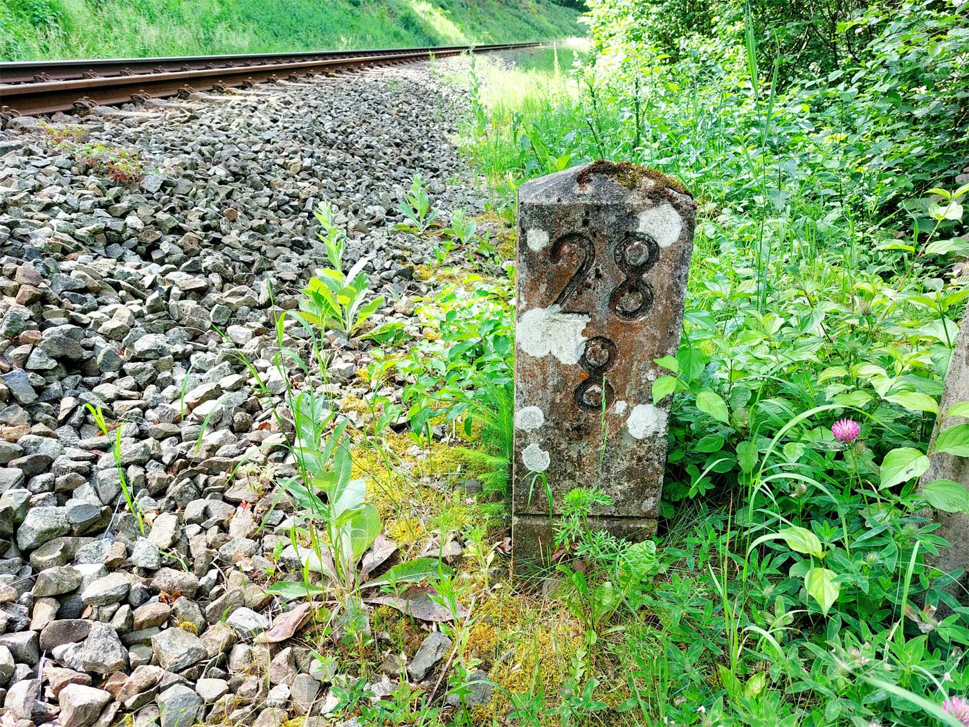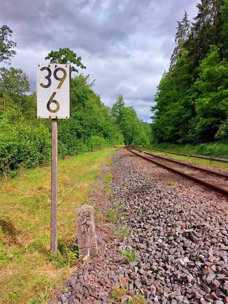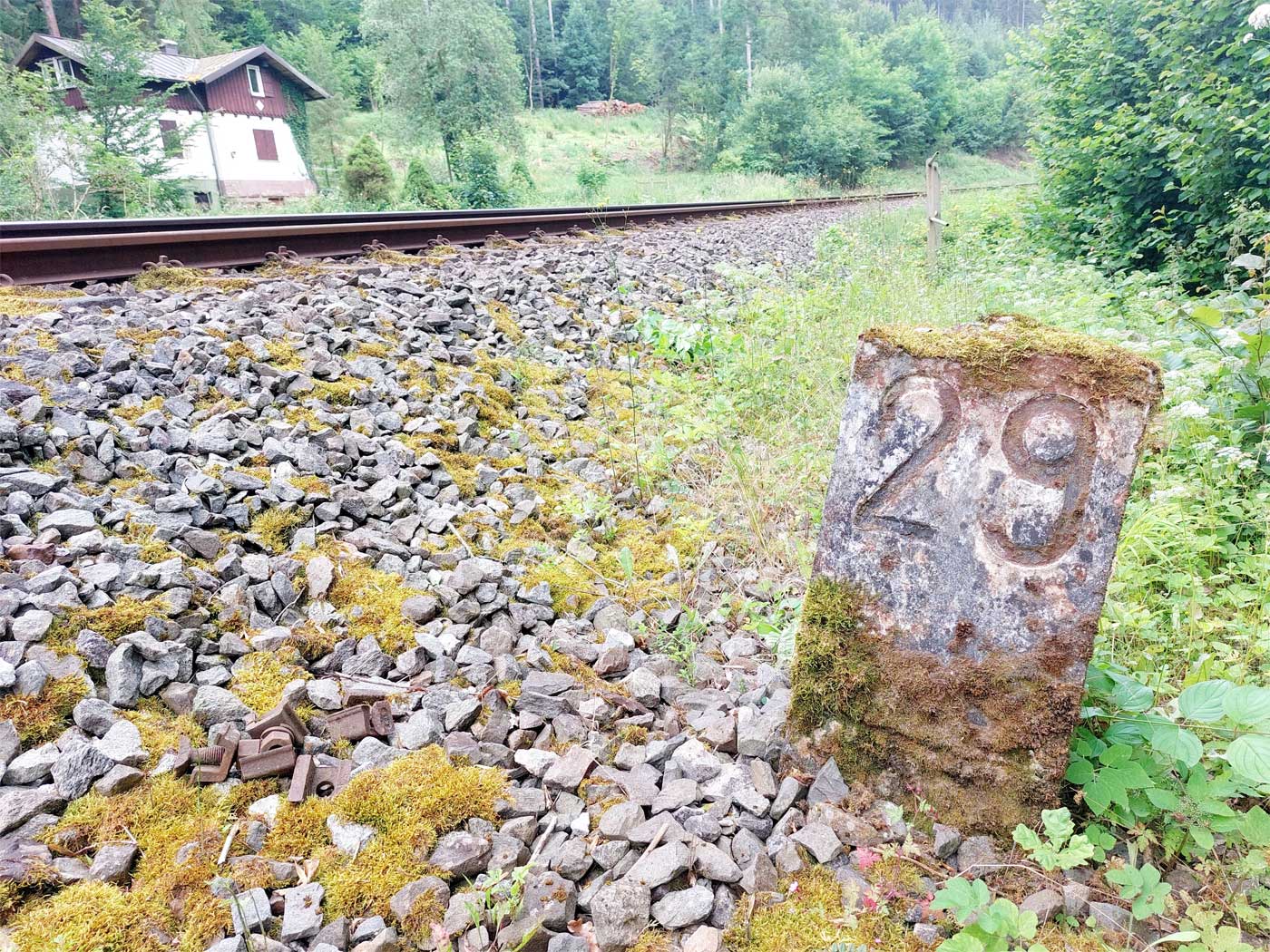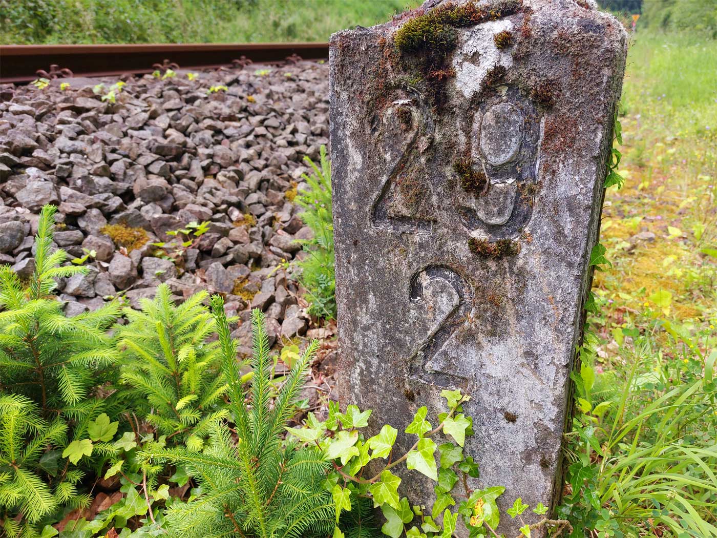 Im Hintergrund die Strecke Eutingen im Gäu - Freudenstadt Hbf - Schiltach mit der Kilometertafel 2,2
