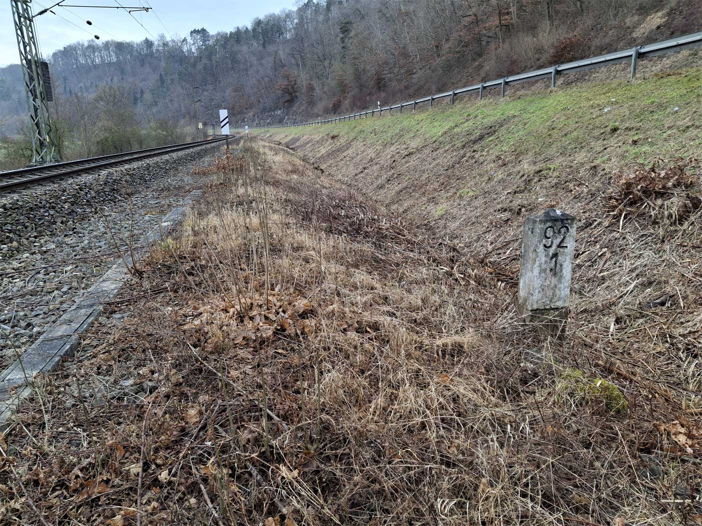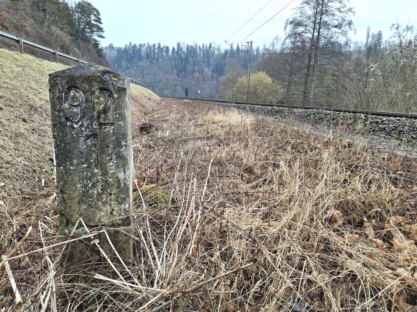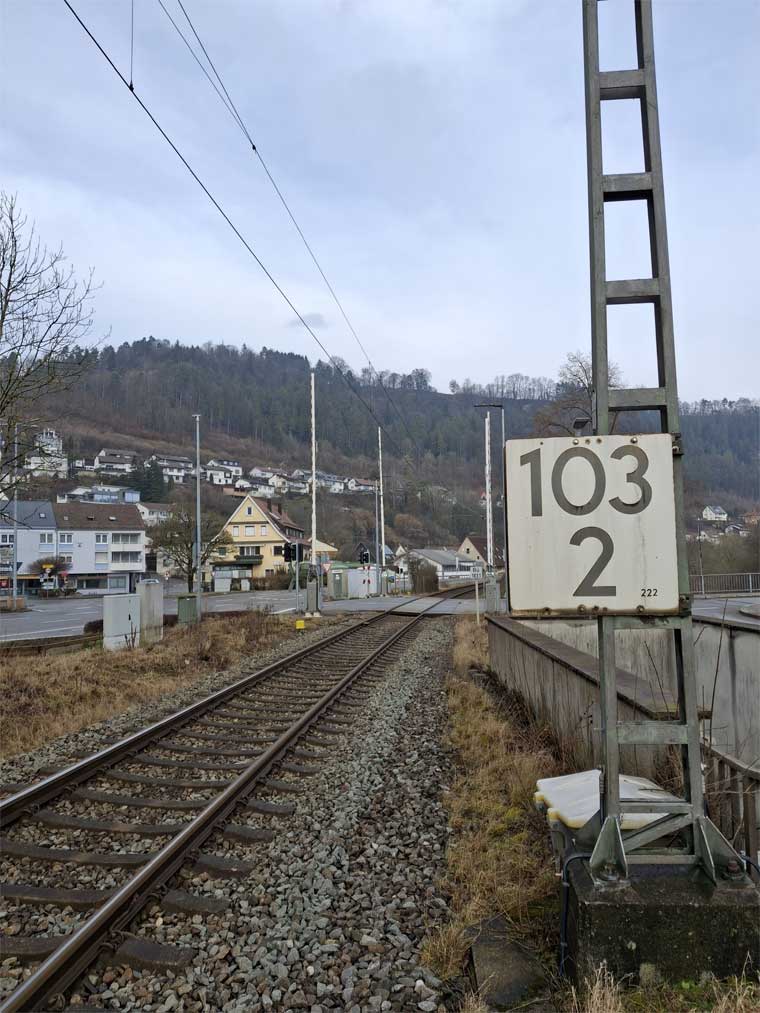km 152,2 (Tafel und Stein) in Tuttlingen - Blick Richtung Plochingen
