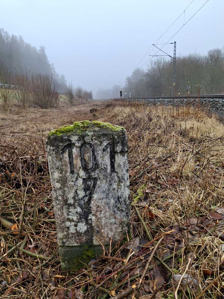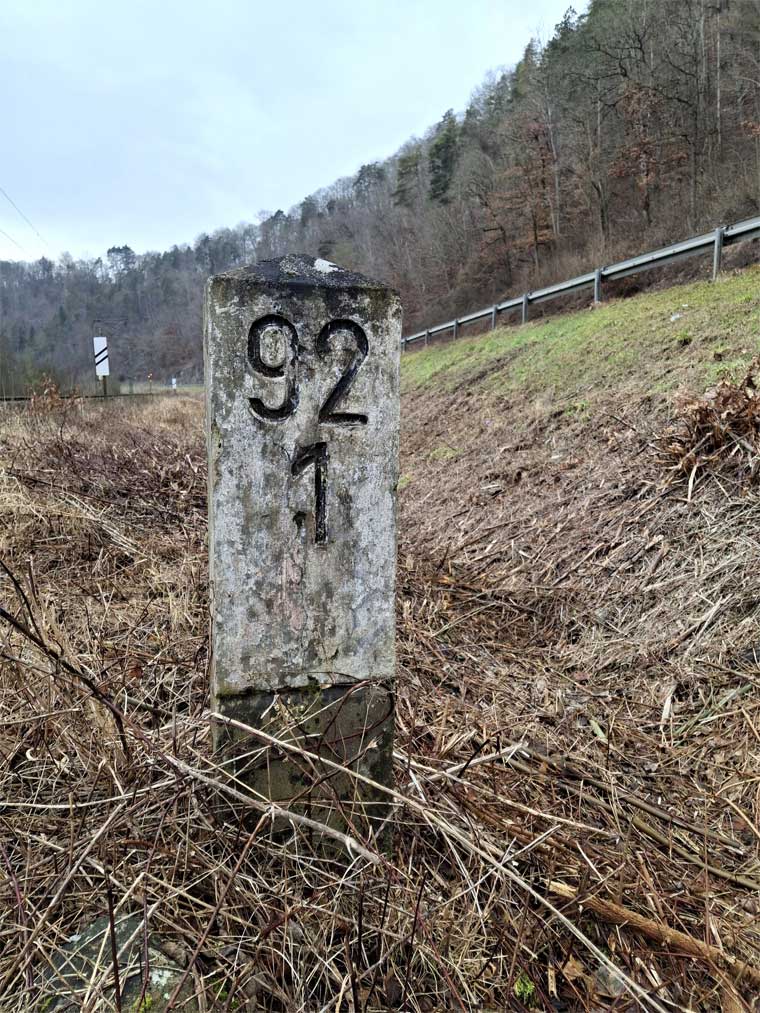 Am linken Bildrand ist ein Kilometerstein zu erkennen.