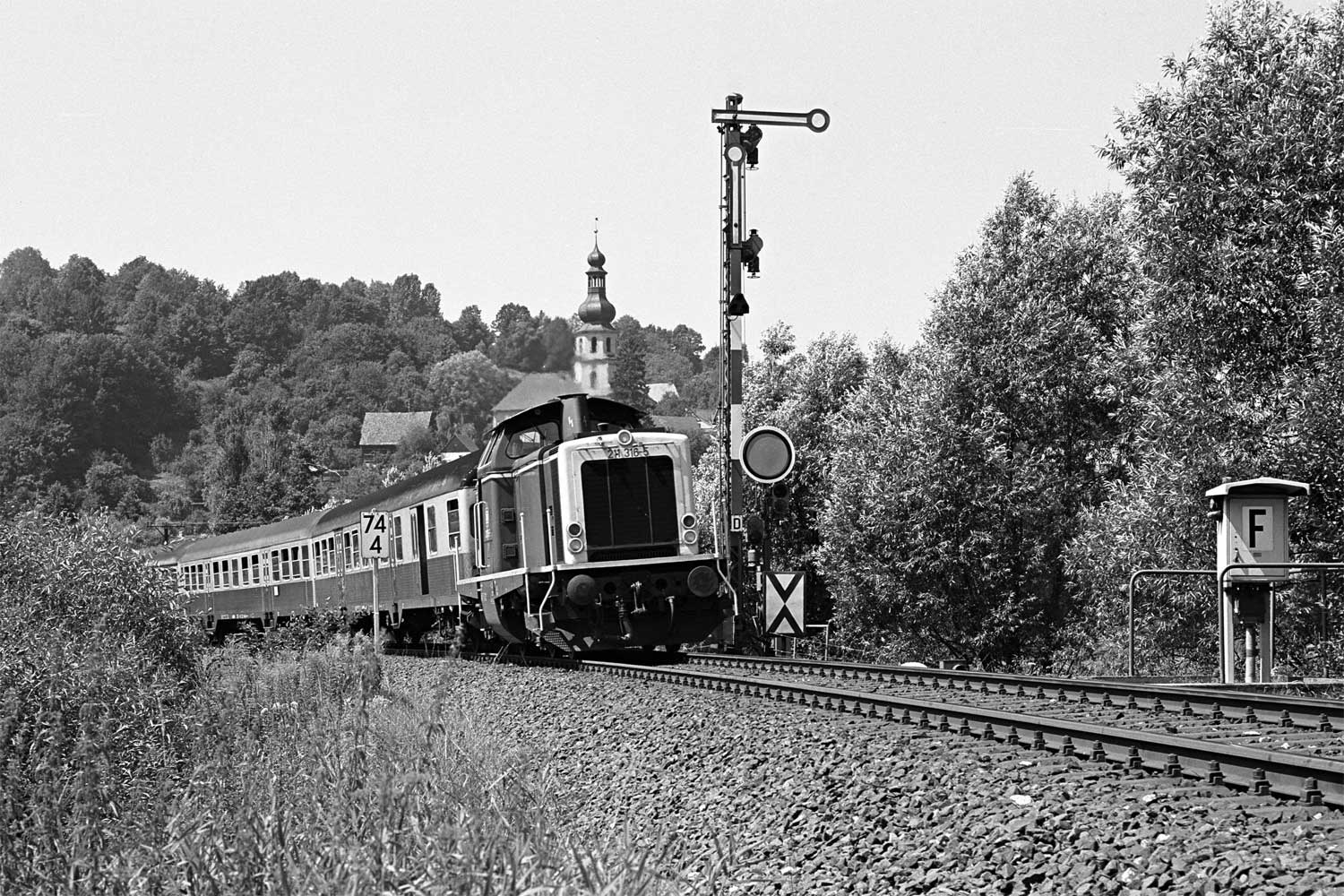 064 295 mit einer großen Rauchfahne bei der Ausfahrt Bf Kirchenlaibach am km 39,4