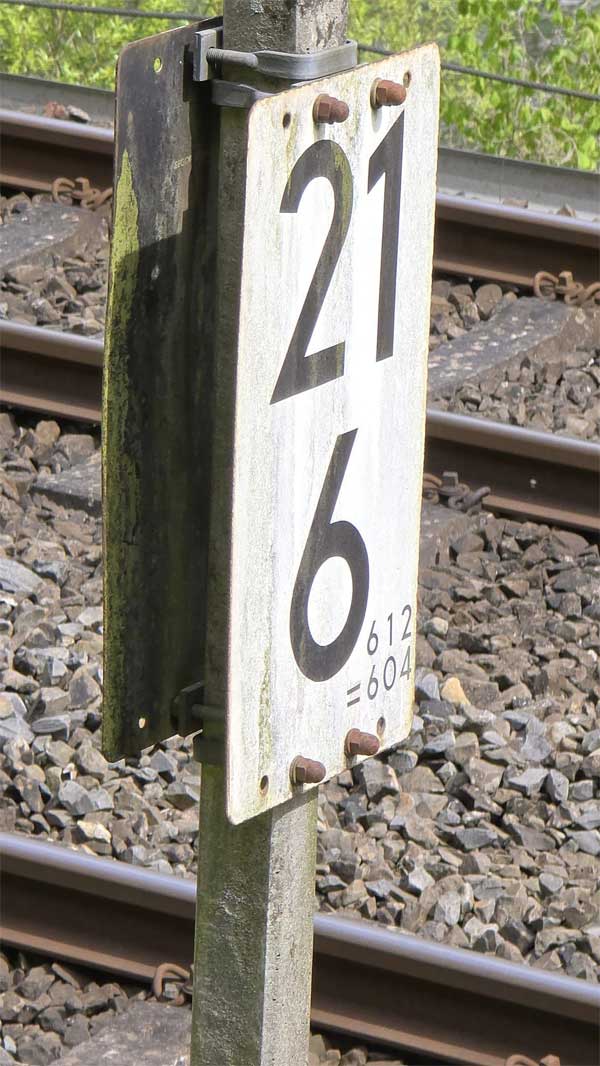 km 21,6 (Tafel im Hintergrund); km 21,7 (Stein rechts neben den Gleisen) und km 21,8 (Stein im Vordergrund) zwischen Löhnberg und Weilburg - Blick Richtung Wetzlar