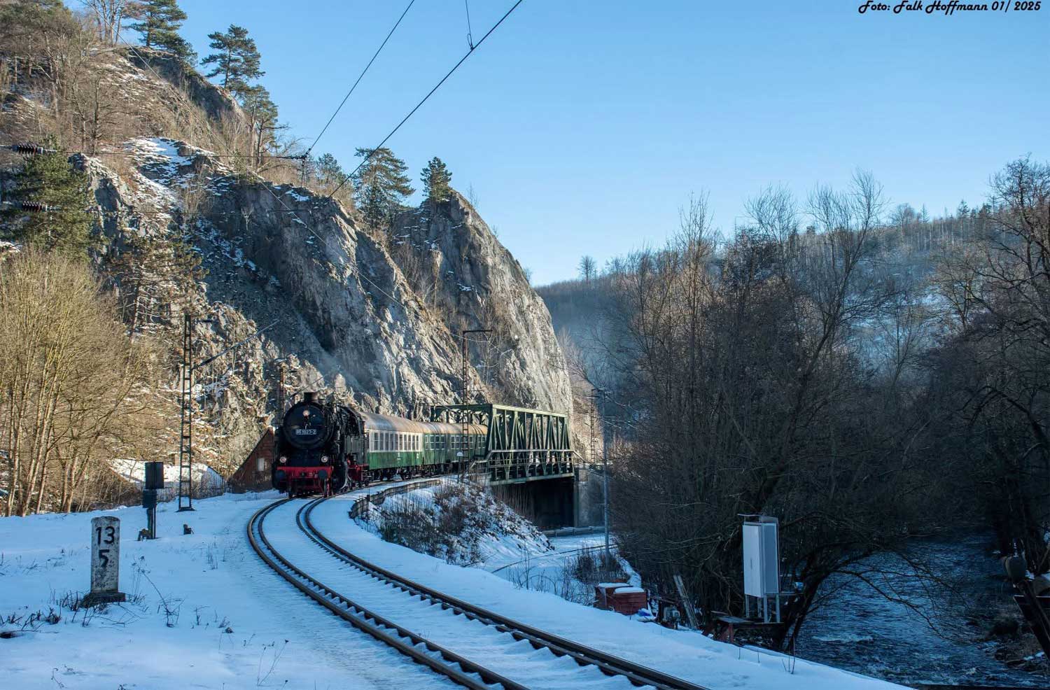 Der Zug befindet sich auf dem Anschlussgleis zu den Kalkwerken, rechts das Streckengleis