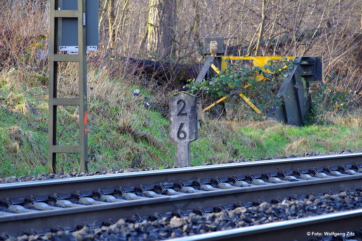 Rechts km 30,5 (Stein) und km 30,6 (Tafel) der Strecke