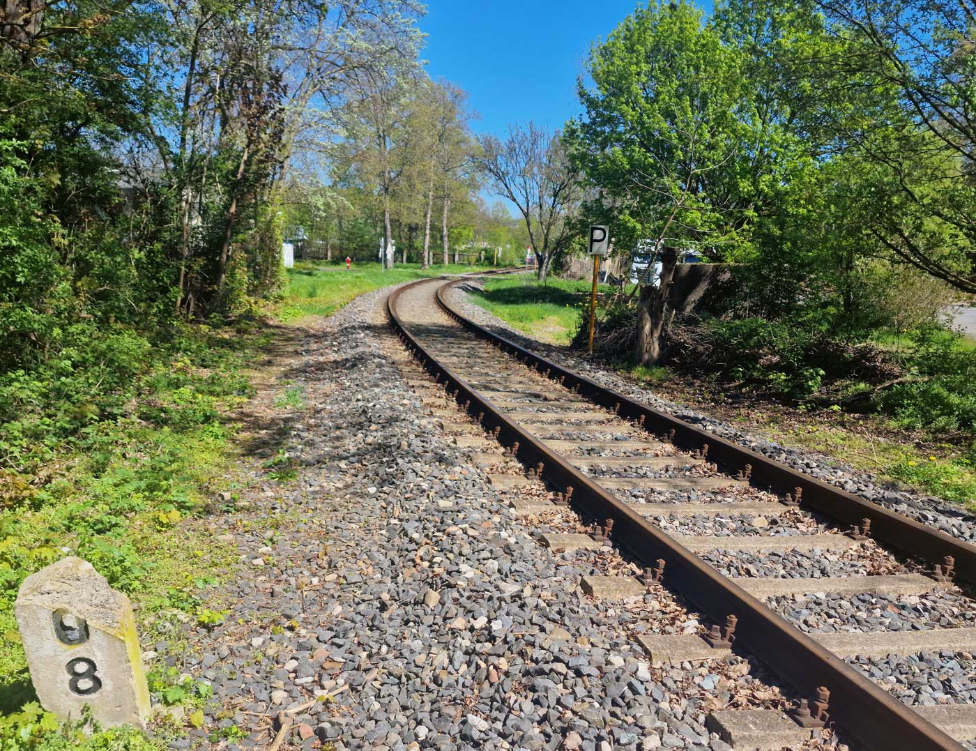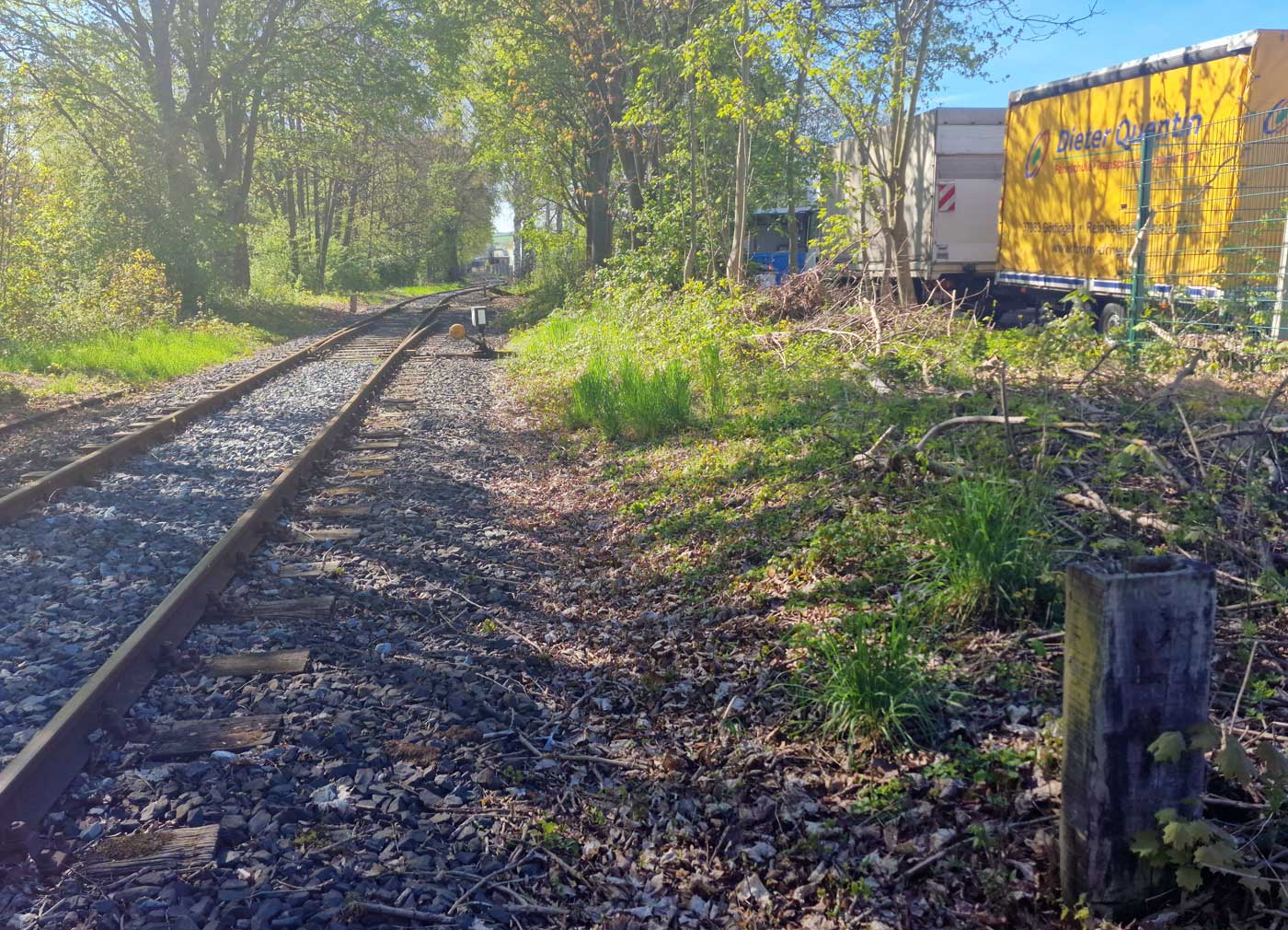 Links das Gleis der Göttinger Industrieanschlußbahn mit der Weichenverbindung zum Hauptgleis
