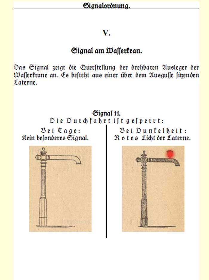 Während des regulären Betriebes mit Dampflokomotiven kennzeichnete das Nachtzeichen als Wasserkransignal zusätzlich die Stellung des prinzipbedingt nicht profilfreien Auslegers eines Wasserkranes quer zum Gleis.