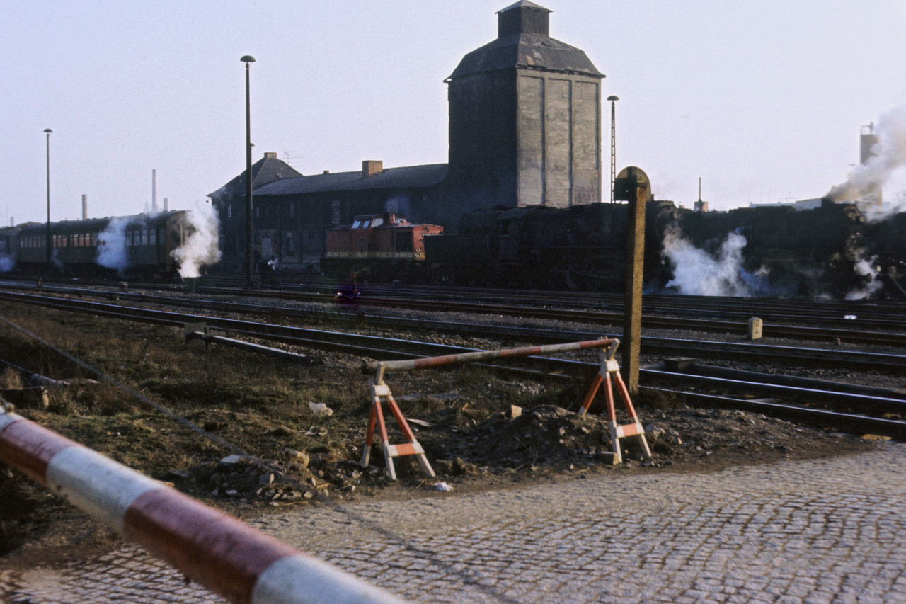 km 0,4 in Haldensleben V 100 und 52 8136 im Bw, dahinter unbekannte 52er Im Vordergrund die Strecke