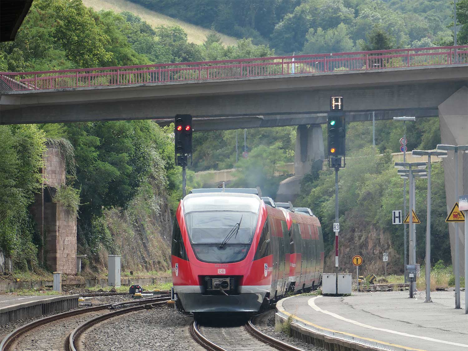 Auf der Freifläche zwischen Zug und Felswand/Stellwerk befanden sich früher die beiden Gleise der rechtsufrigen Nahetalbahn