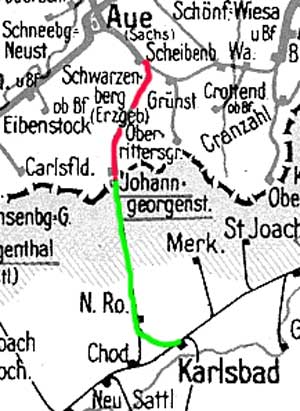 | Infolge des Uranbergbaus durch die WISMUT in den Jahren 1946 bis 1964 wurde die Strecke zwischen Erlabrunn und Breitenbrunn sowie zwischen Erla und Schwarzenberg komplett neu trassiert und auch der Tunnel bei Schwarzenberg wurde neu gebaut. |