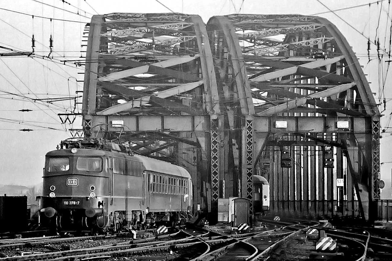 Blick auf die noch viergleisige Brücke über den Rhein