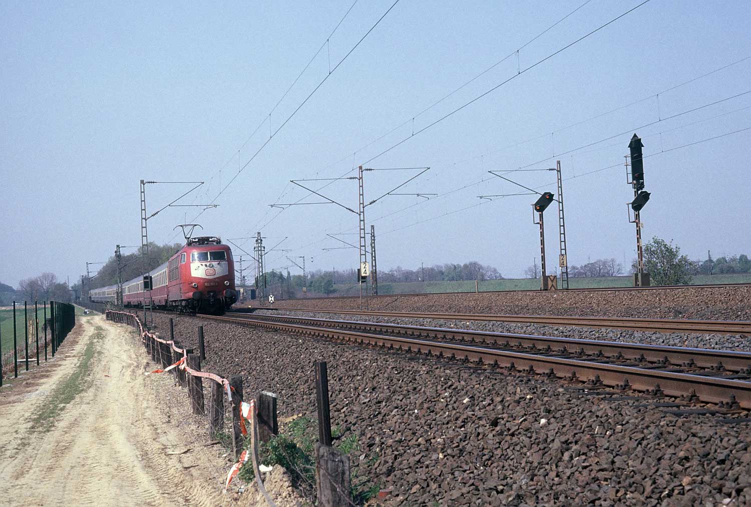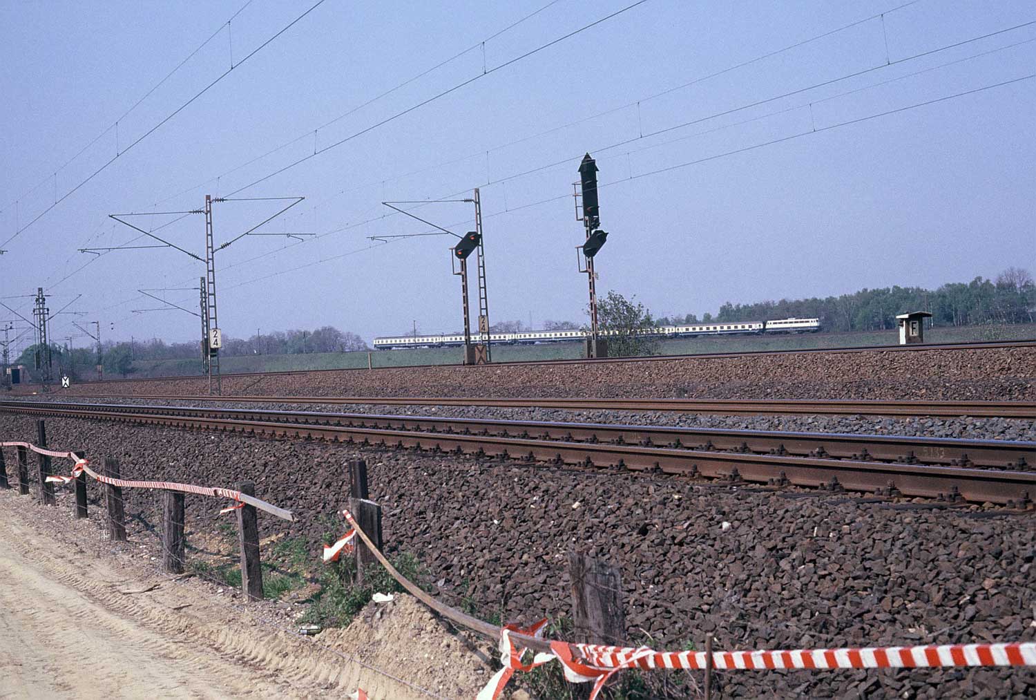 km 2,4 - Blick Richtung Duisburg Hbf Gleise von links nach rechts: Gegenrichtungsgleis der Strecke 2184 Gegenrichtungsgleis der Strecke 2290 Richtungsgleis der Strecke 2290 Richtungsgleis der Strecke 2184 Foto: Wolf-Dietmar Loos, 14.04.1991