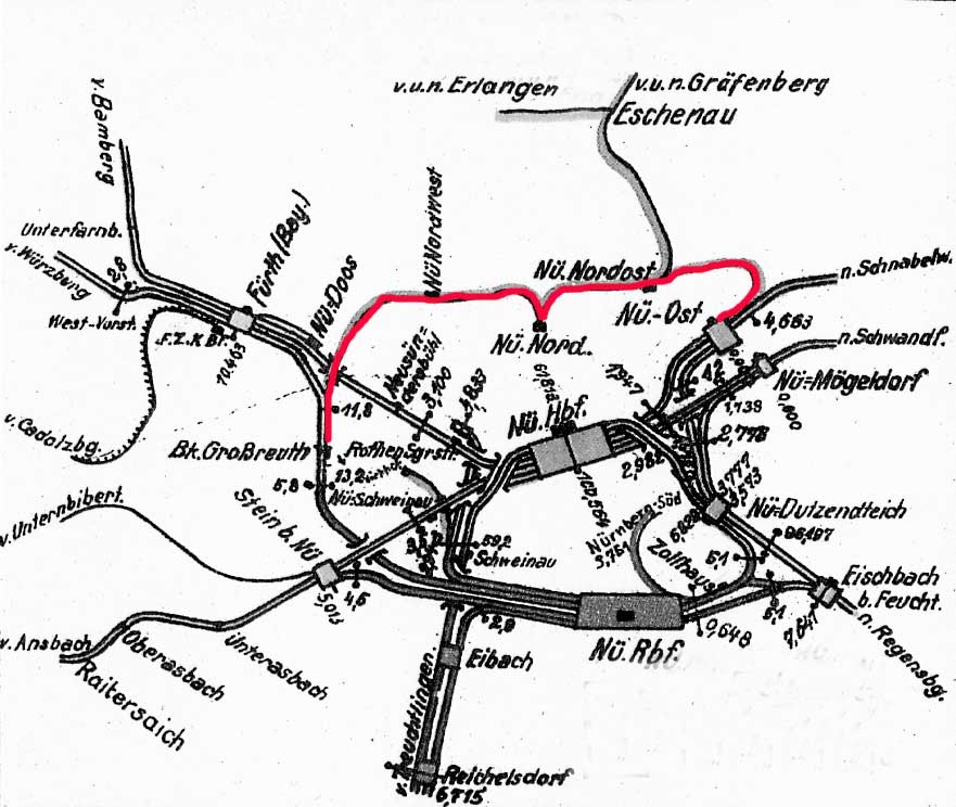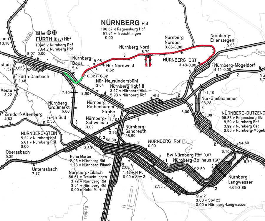 Nürnberg Ost - Nürnberg Nordost - Nürnberg Nord (Kopfbahnhof) - Nürnberg Nordwest - Abzw Großreuth