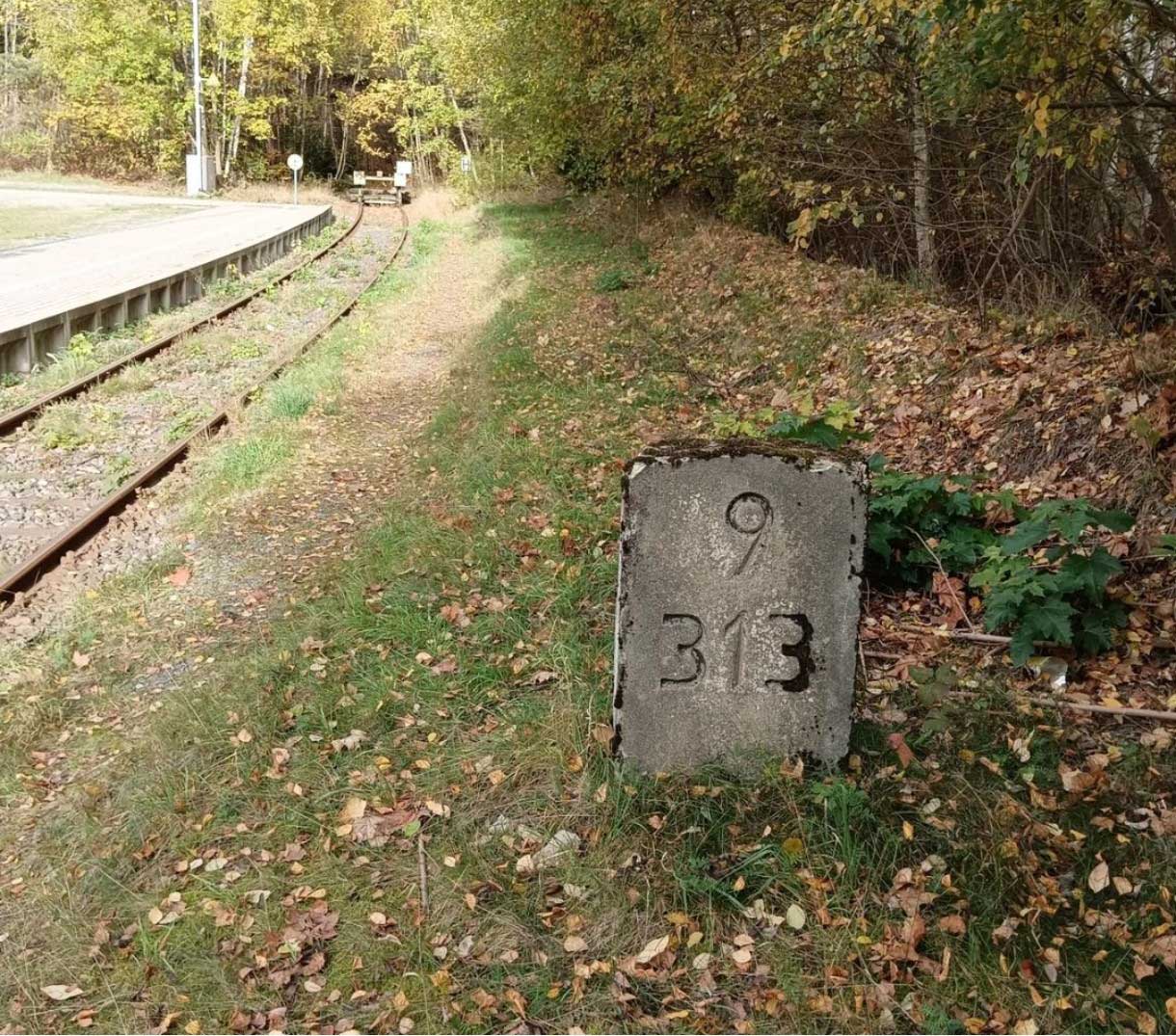 Auf der anderen Seite des Steines ist die Angabe km 9,313 (von Münchberg) zu sehen.