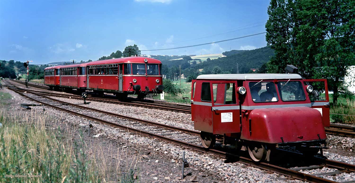 Im Vordergrund die Bahnmeisterei-Draisine Kleinwagen - Klv 12 - mit der Nummer 12 488