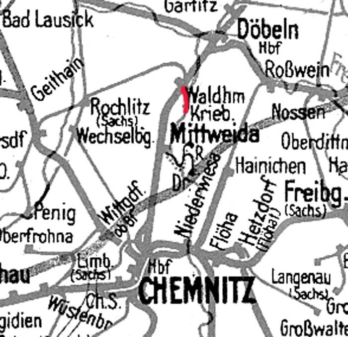 | Waldheim | 0,0 | km 34,93 der Strecke Riesa - Döbeln - Karl-Marx-Stadt Hbf (RC) |