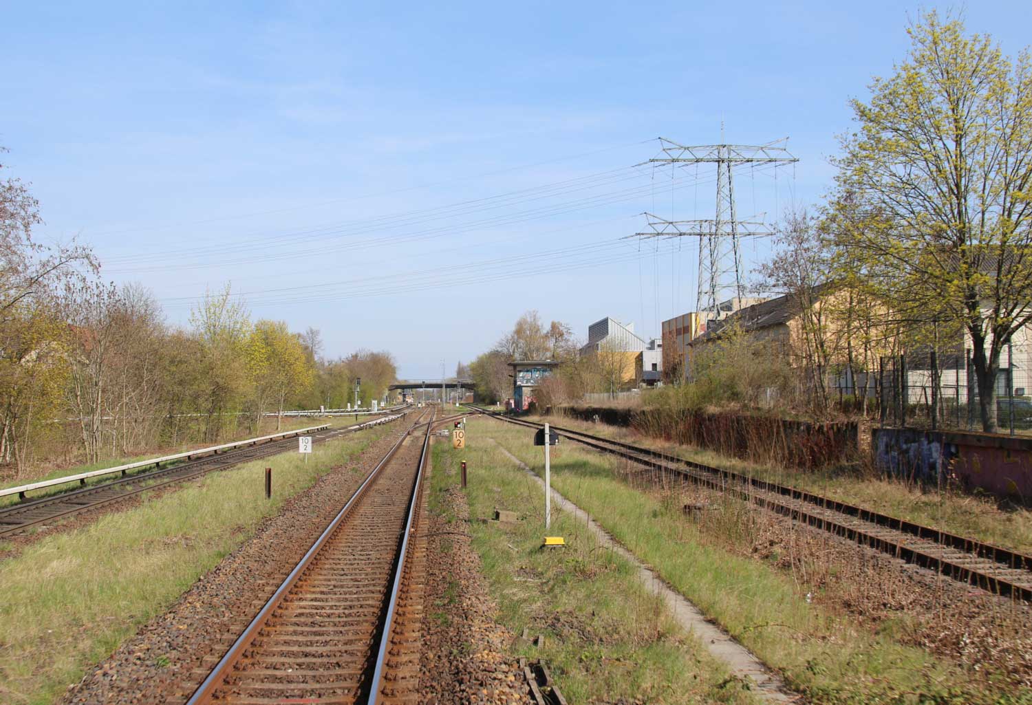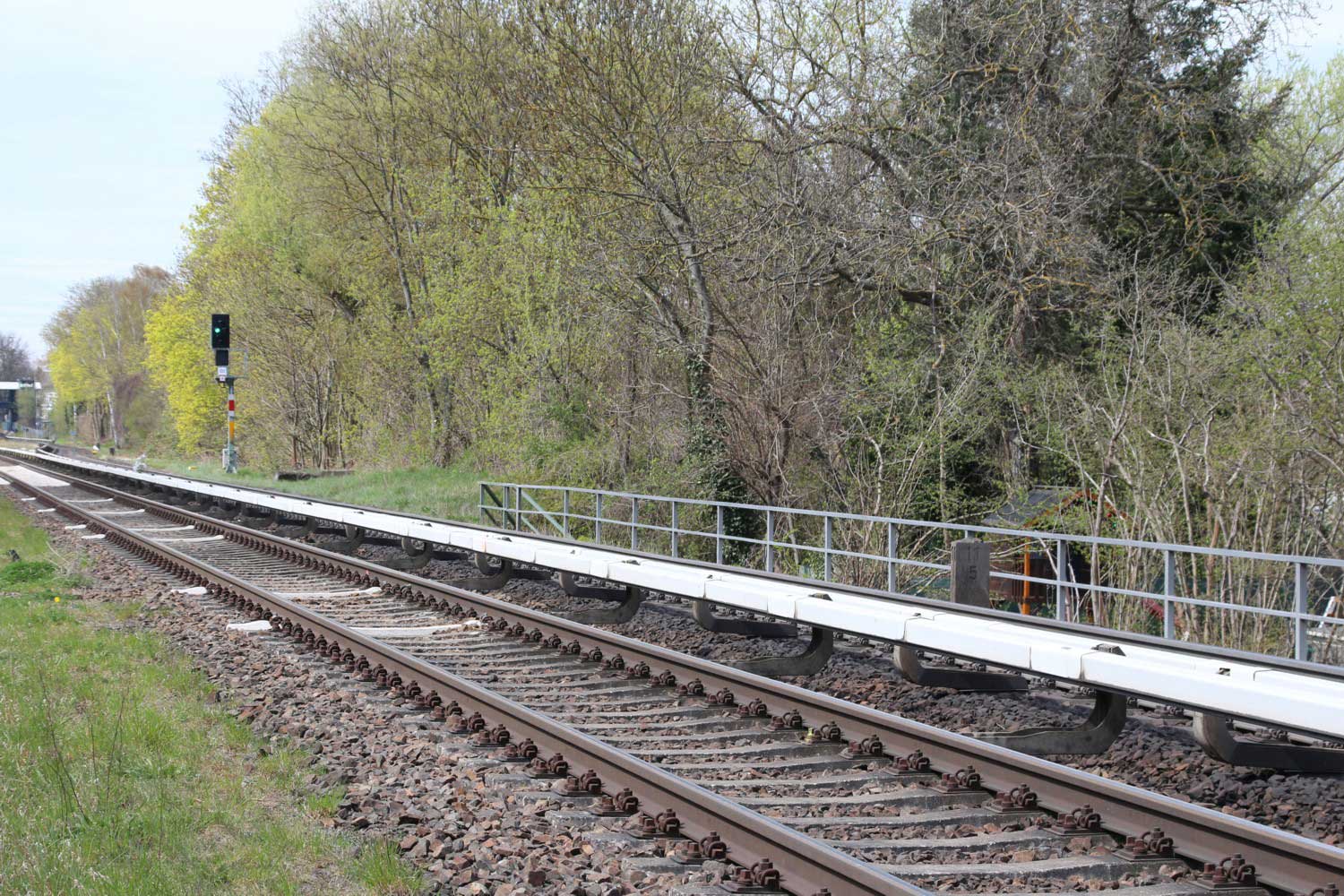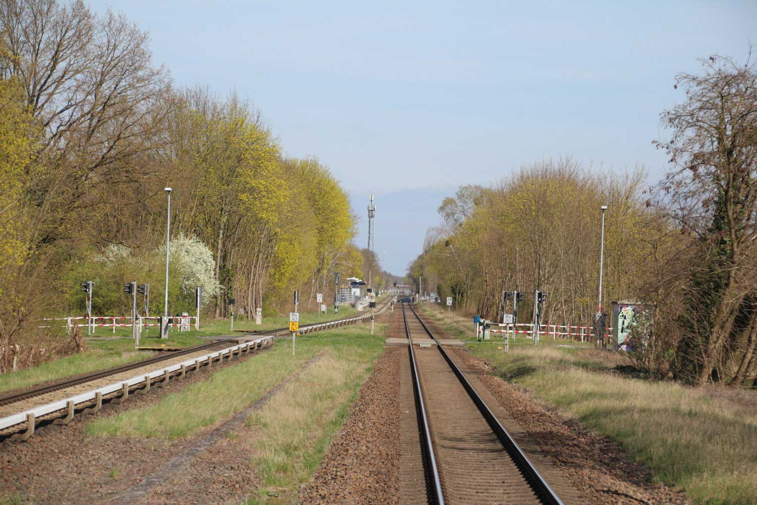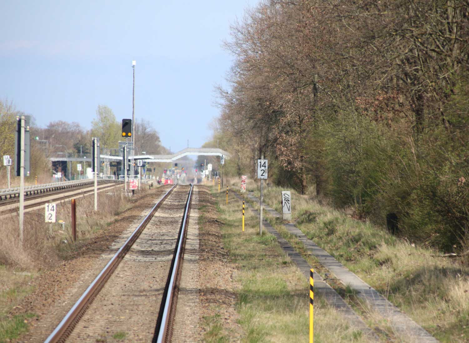 km 16,6 (links) in Hoppegarten (Mark) - Blick Richtung Strausberg km 16,6 (rechts) gehört zur Ostbahn (6078) Foto: Matthias Manske, April 2025