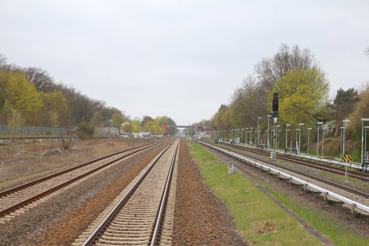 Petershagen Nord - Blick Richtung Strausberg km 24,0 (rechts) gehört zur Ostbahn (6078) Foto: Matthias Manske, April 2025