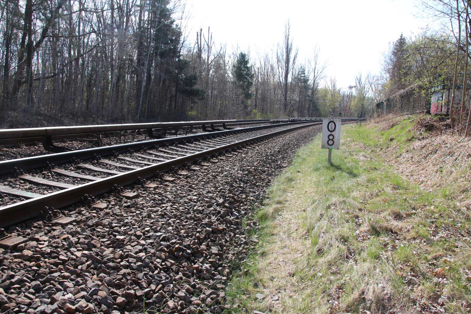 km 0,0 (Tafel und Stein) am Abzw Grünauer Kreuz Südost (S-Bahn) - Blick Richtung Berlin-Schönefeld