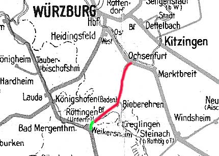 Ochsenfurt 0,0 - ehemalige Grenze Königlich Königlich Bayerischen Staatseisenbahnen/Württembergische Staats-Eisenbahnen km 36,262 = (km 0,290 - Weikersheim 0,0) (1947)