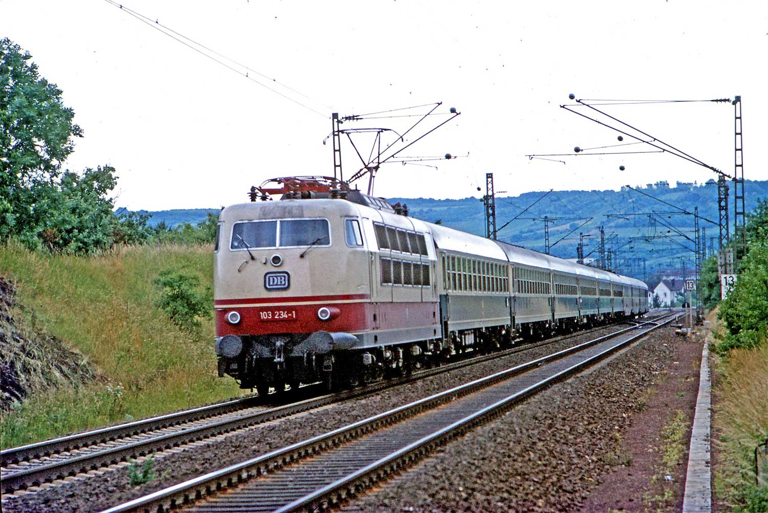 Mitten auf der Nahebrücke (Kilometer-Wechsel 0,0) rollt am 8. Juli 1981 die noch geschürzte 103 228 mit ihrem IC 524 HEINRICH DER LÖWE (München - Braunschweig) Richtung Bingerbrück; das Einfahrtsignal alter Bauart steht noch.