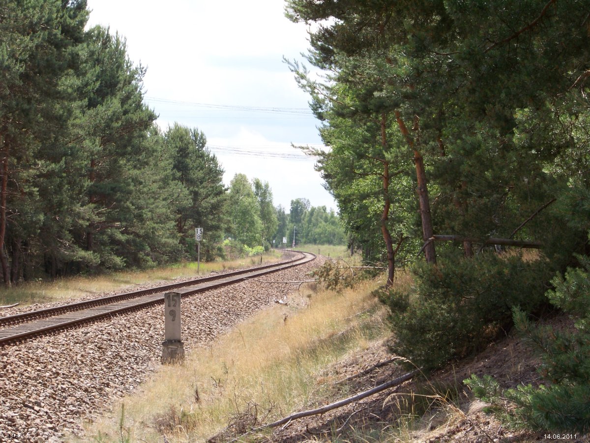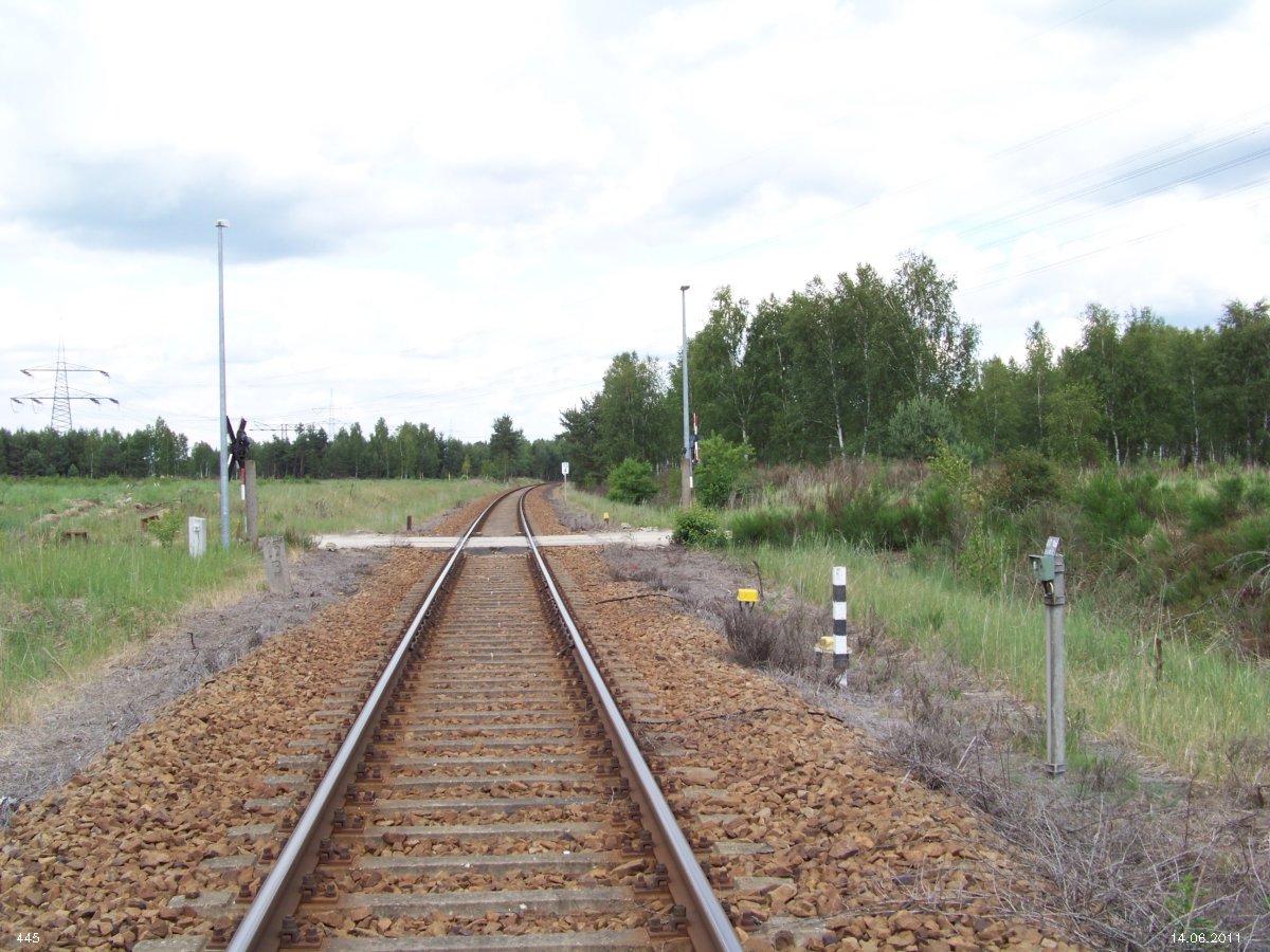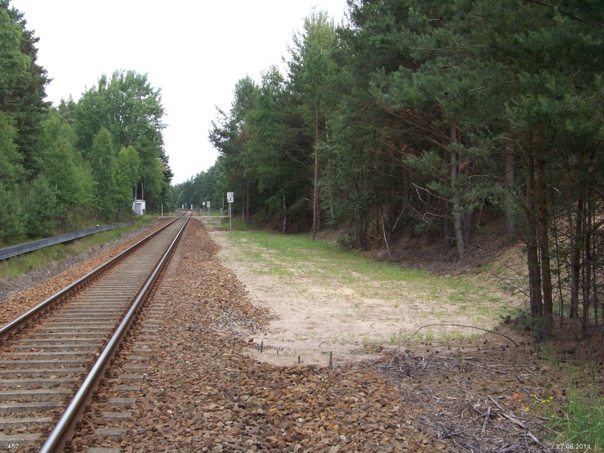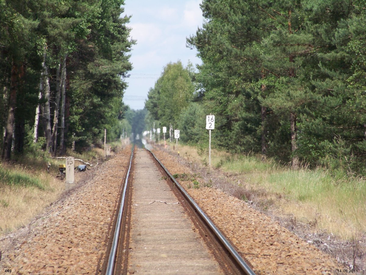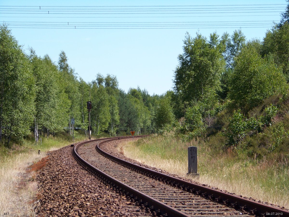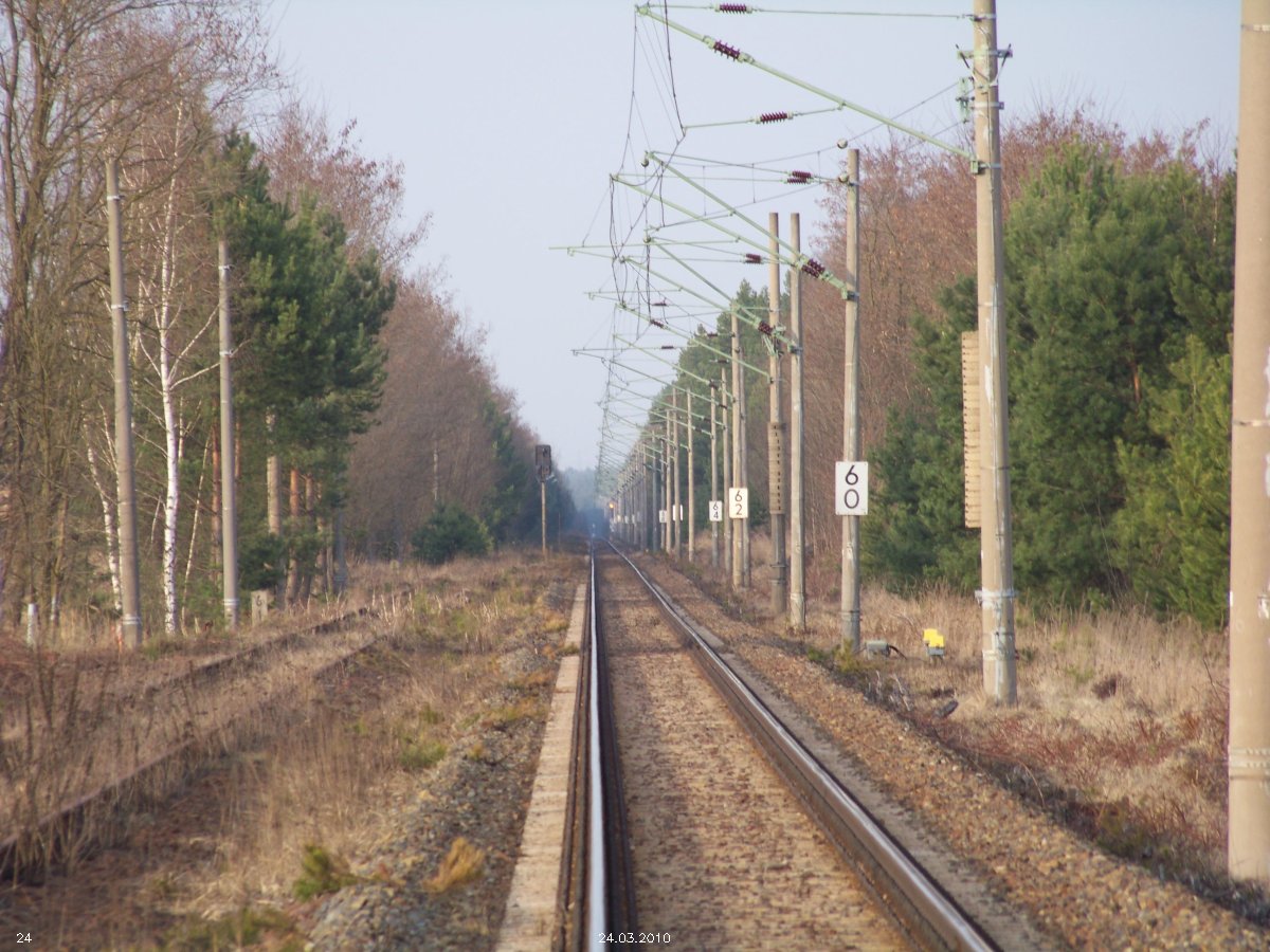 | km 53,00 der Strecke Großenhain Cottb. Bf 0,0 - Senftenberg 45,29 - Cottbus 80,00 - Peitz 94,81 - Streckenunterbrechung - Grunow (Niederlausitz) 129,27 - Frankfurt (Oder) 152,78 |