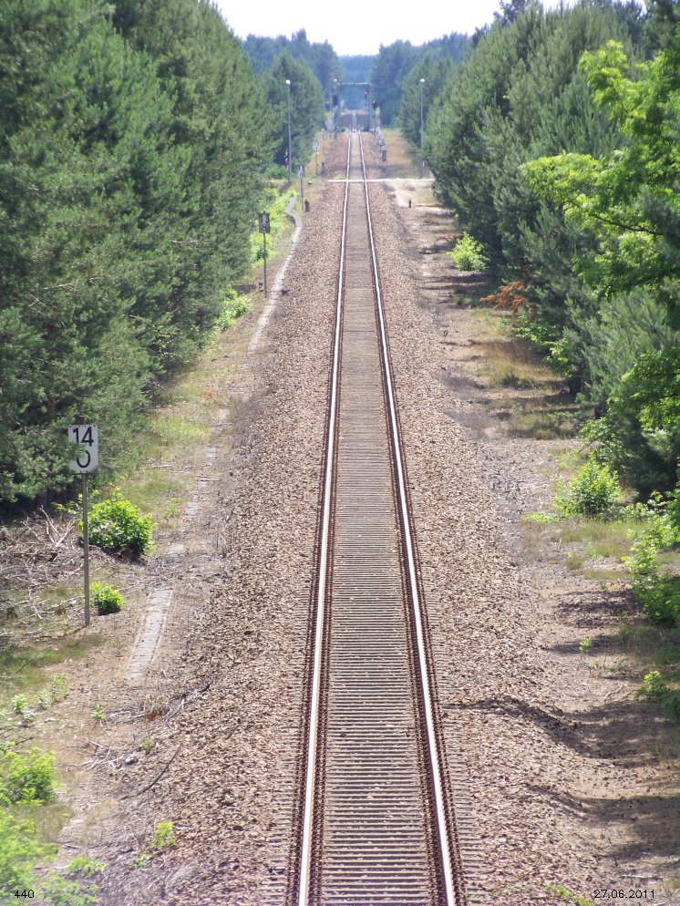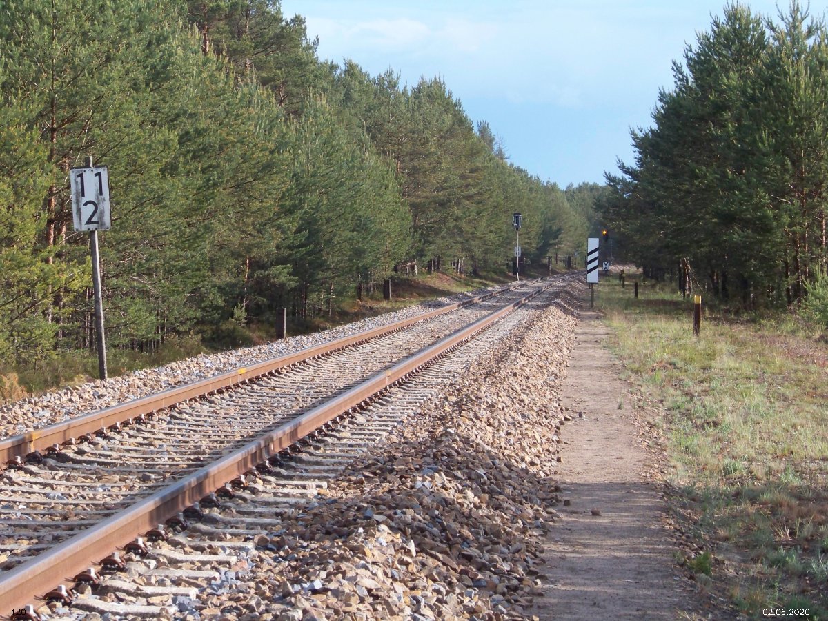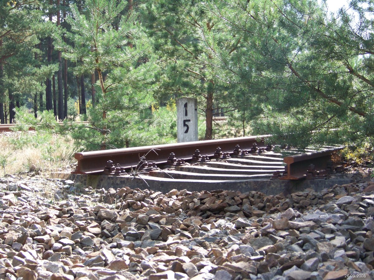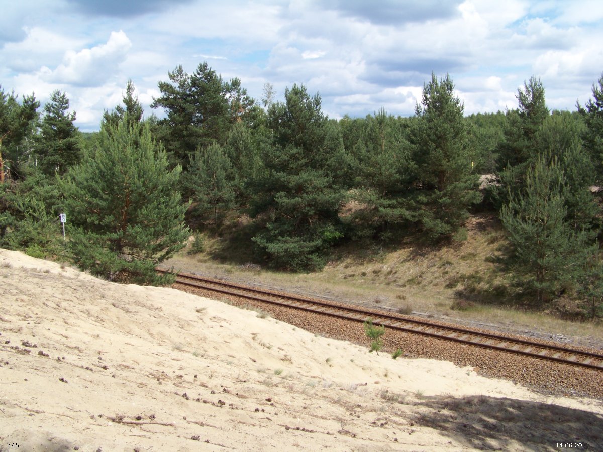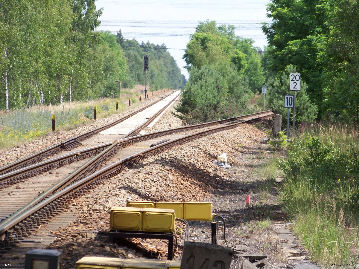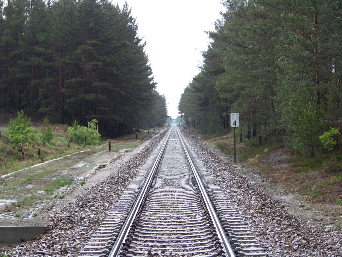 | km 53,00 der Strecke Großenhain Cottb. Bf 0,0 - Senftenberg 45,29 - Cottbus 80,00 - Peitz 94,81 - Streckenunterbrechung - Grunow (Niederlausitz) 129,27 - Frankfurt (Oder) 152,78 |