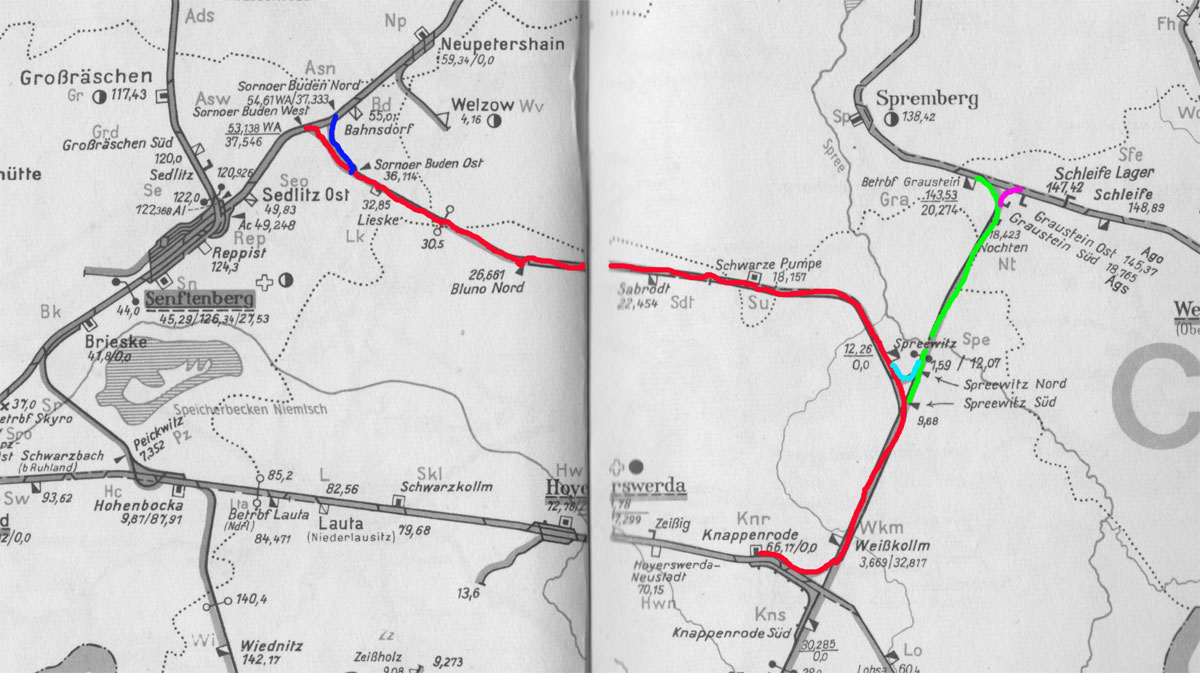 Knappenrode 0,0 - Abzw Spreewitz Süd 9,67 - Schwarze Pumpe 18,16 - Abzw Sornoer Buden Ost 35,83 - Abzw Sornoer Buden West 37,48