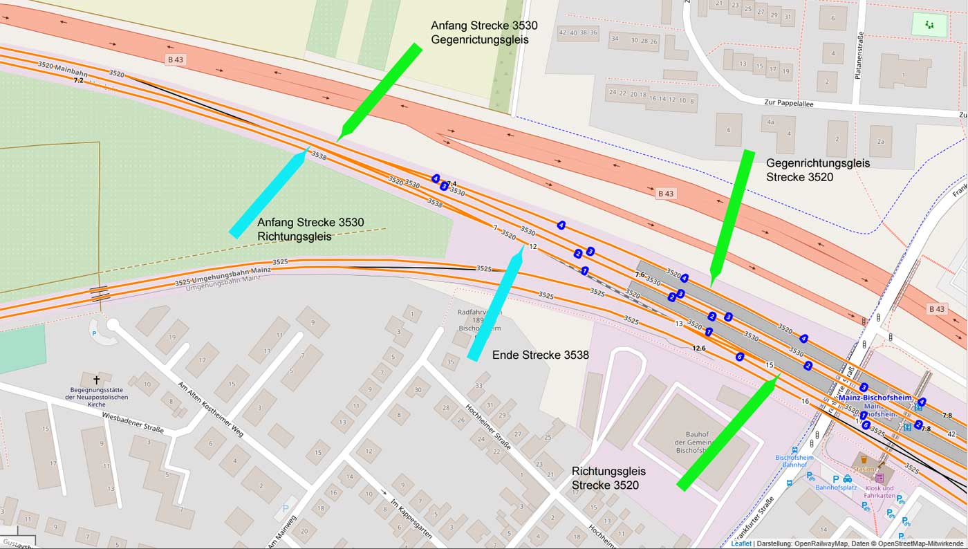 | Mainz-Bischofsheim | 7,78 | km 12,80 der Strecke Mainz-Mombach 0,0 - Mainz-Bischofsheim Pbf 12,80 - Mainz-Bischofsheim Gbf 13,11 |