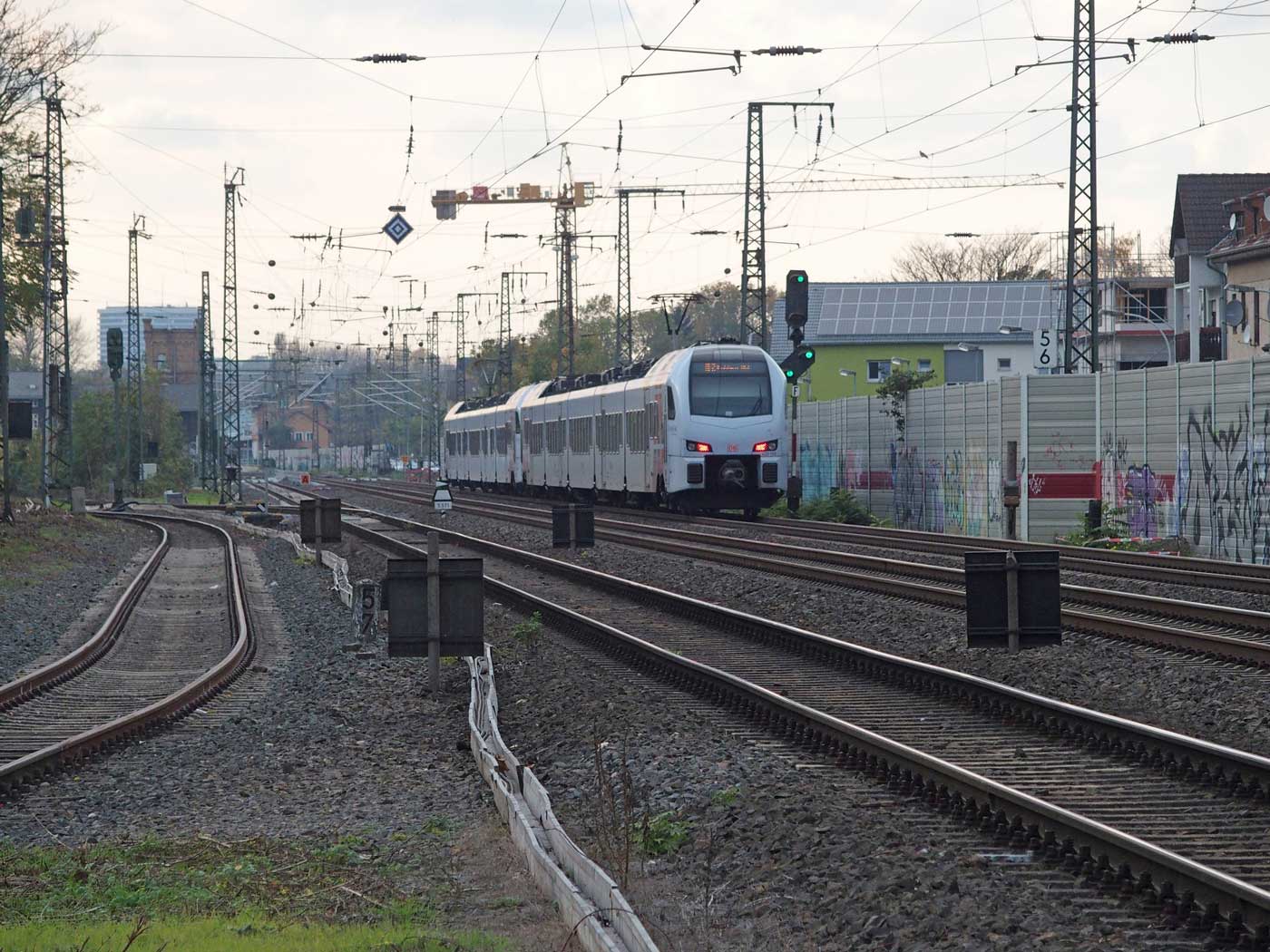 Der Zug befindet sich auf dem Gegenrichtungsgleis der Strecke nach Frankfurt (Main) Hbf